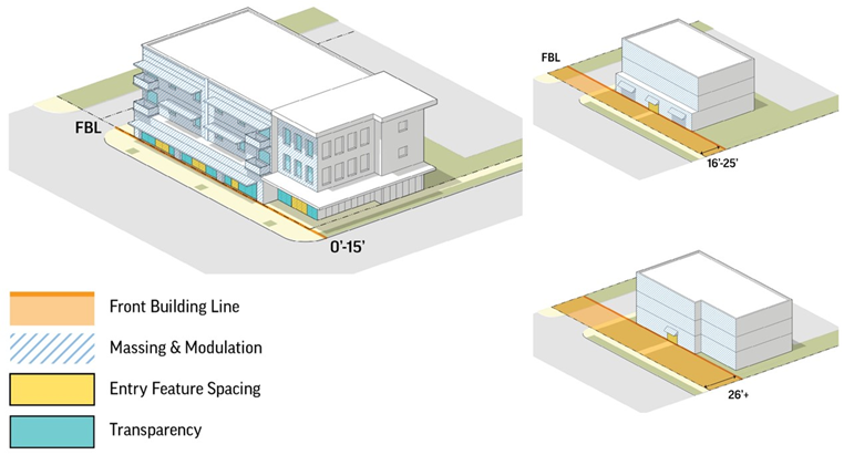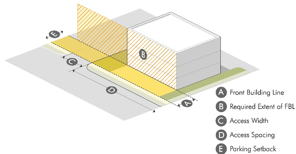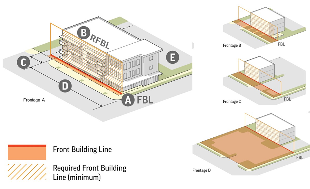 Figure 6-2. Frontage types are differentiated based on the location of the front building line (FBL—A), the extent of the front building line occupied by the building (Required FBL—B), access widths (C), and parking location and extent along frontage (E). Coordinating frontage design of multiple buildings and sites along a block impacts the character of the streetscape and the block.