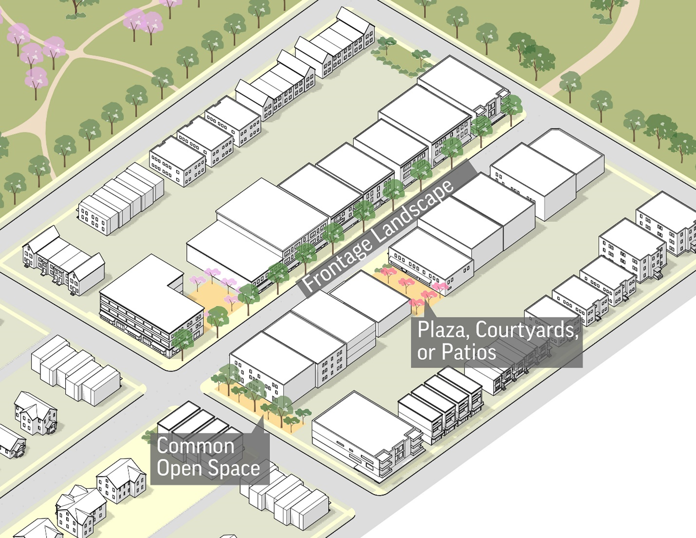 Figure 6-6. Frontage types, design standards and administrative adjustments should be applied based on the streetscape design, block and building pattern, and desired character of the area.