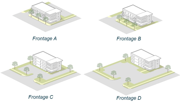 Figure 6-3. The different frontage types and frontage type standards in Table 6-3 determine how a building and site relates to the streetscape impacting the character of the streetscape, block and area.