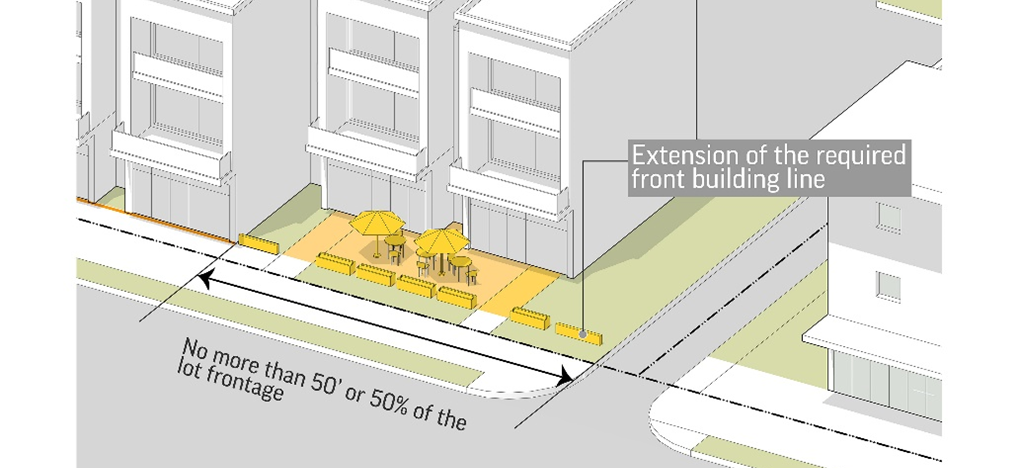 Figure 6-4. Consistent front building lines along a block are established by the building placement or active open spaces with defining edges and vertical elements at the extension of the front building line.