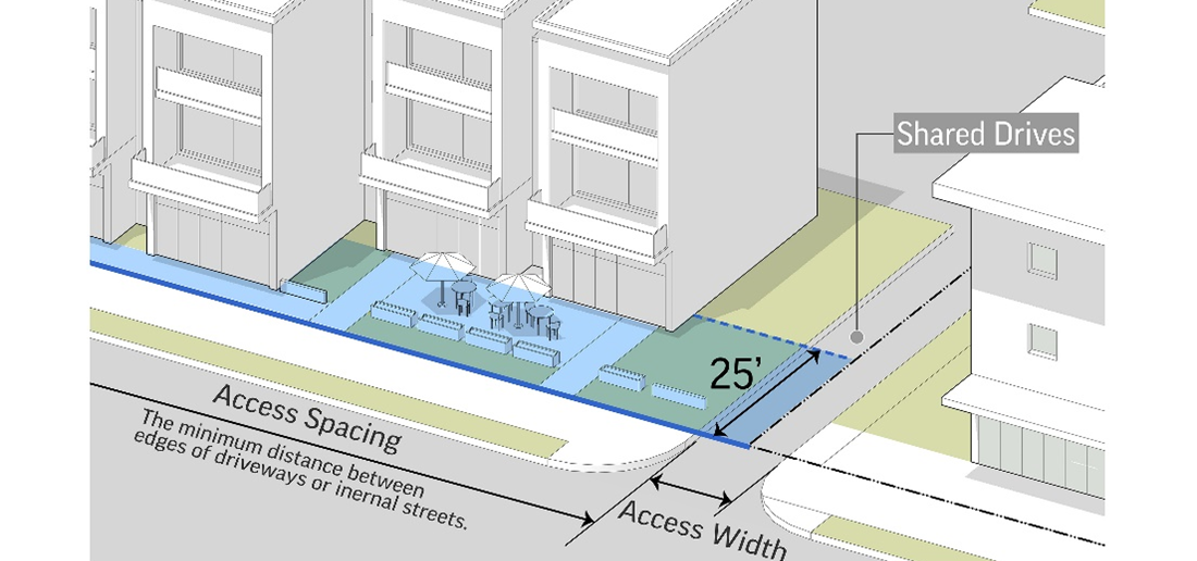 Access spacing specifies the minimum distance between edges of driveways or internal access streets. However, the Englewood Standards and Specifications Manual may specify different access standards on any particular lot, street, or block.