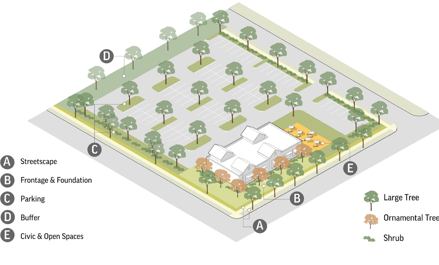 Figure 8-1. Landscape standards and plans are broken out by different components of the site—streetscape (A), foundation and frontage (B), parking (C), buffers (D), and civic and open spaces (E).