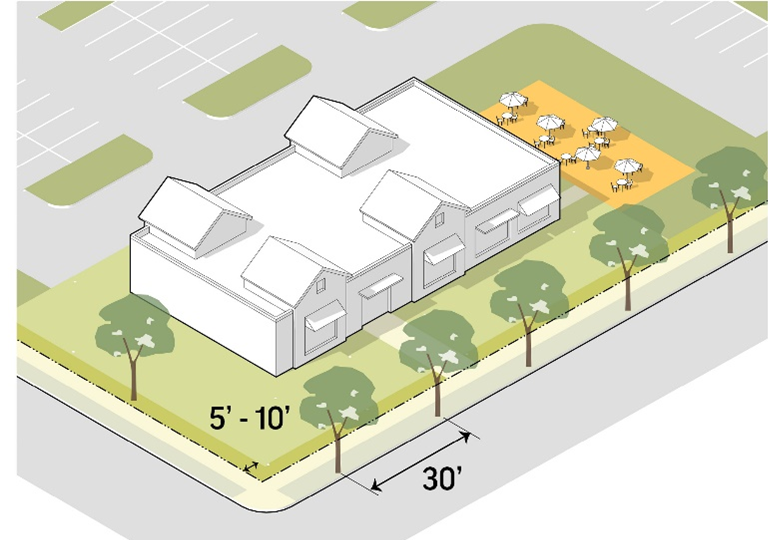 Figure 8-2. Street trees shall be located between the sidewalk and curb or within the first 5 to 10 feet of the front lot line or street if space is constrained.