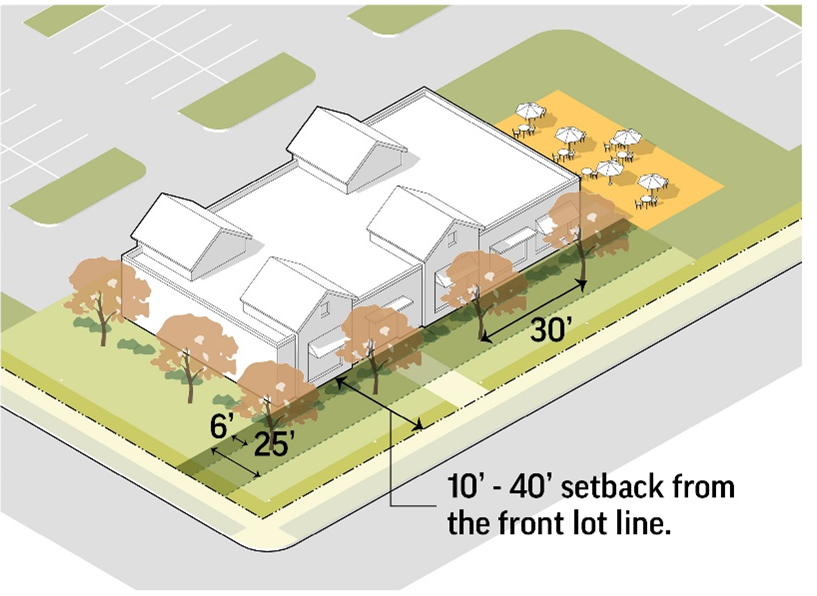 Figure 8-3. Foundation and frontage plantings provide a second layer of landscape to accent the building, particularly where buildings are setback more from the street.