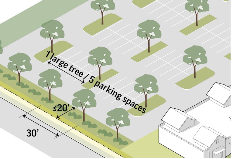 Figure 8-4. Parking lot landscape is dependent on the size, location, and relation to the streetscape as specified in section 16-7-4.