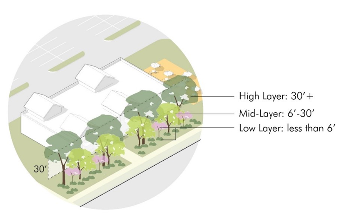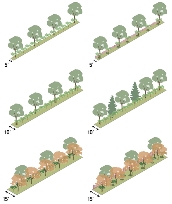 Figure 8-5. Buffers—dependent on context, should address three layers of mitigation—high layer with larger canopy trees; mid layer with small trees; and low layer with shrubs, evergreens and ground cover.