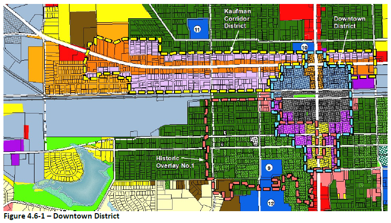 Boundaries of the Kaufman Corridor District and associated sub-districts are each based on Figure 4.6-2 - Kaufman Corridor District Zoning Map. The Kaufman Corridor District shall be composed of two sub-districts - Core and Transition. The following section provides the standards for setbacks, height, and density within the Kaufman Corridor sub-districts.