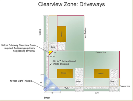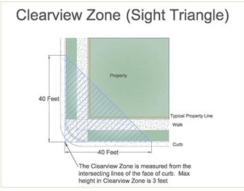 CLEARVIEW ZONE; INTERSECTIONS: The area of a corner lot closest to the intersection which is kept free of impairment to allow full view of both pedestrian and vehicular traffic. Such area is established by marking a point at which the two curb lines intersect, measuring back forty feet along each street, and drawing a line between the two back points to form a triangular area, also referred to as “sight triangle”. See figure 2 below: