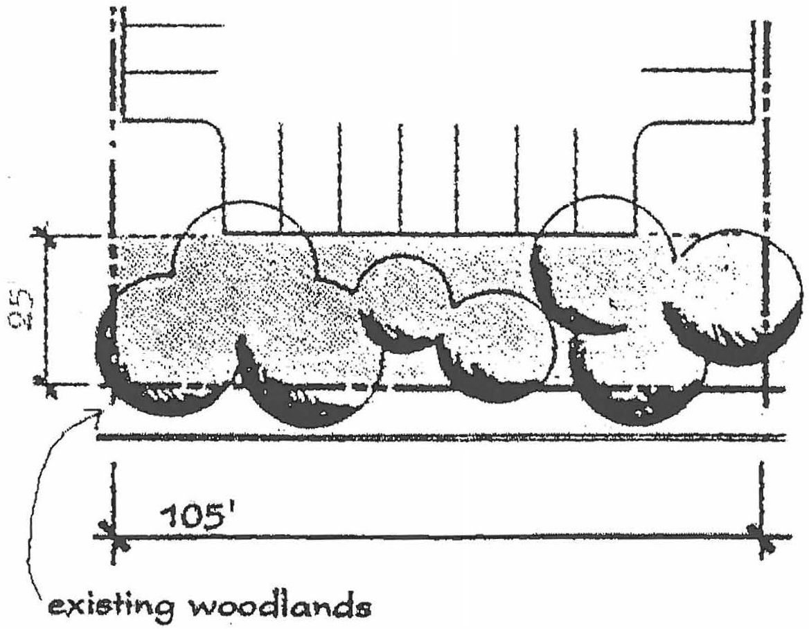 A visual screen shall be established and maintained around that portion of the mining site that is being excavated or being used for the storage of minerals. Such screening is required only when such areas are visible at eye-level at ground elevation, at the time of permit issuance, from state-maintained right(s)-of-way, publicly-owned areas which have been maintained essentially in their natural state of vegetation, adjacent residences and other buildings, but not including accessory buildings. Said screening shall meet the requirements of the "Type B; options 1 and 3" buffer of the buffer types in the appendices of this chapter. With a minimum buffer width of 30 feet wide, maturing trees shall be spaced not more than 30 feet apart and only evergreen plantings shall be utilized to meet the requirements of this section. When excavated areas have been reclaimed in accordance with the following: The Mining Act of 1971, of North Carolina and as amended, and Chapter 5 of the North Carolina Administrative Code, Title 15 Environment and Natural Resources, required artificial screening may be removed.