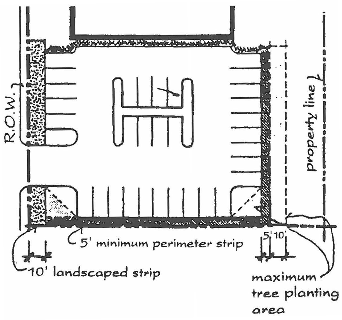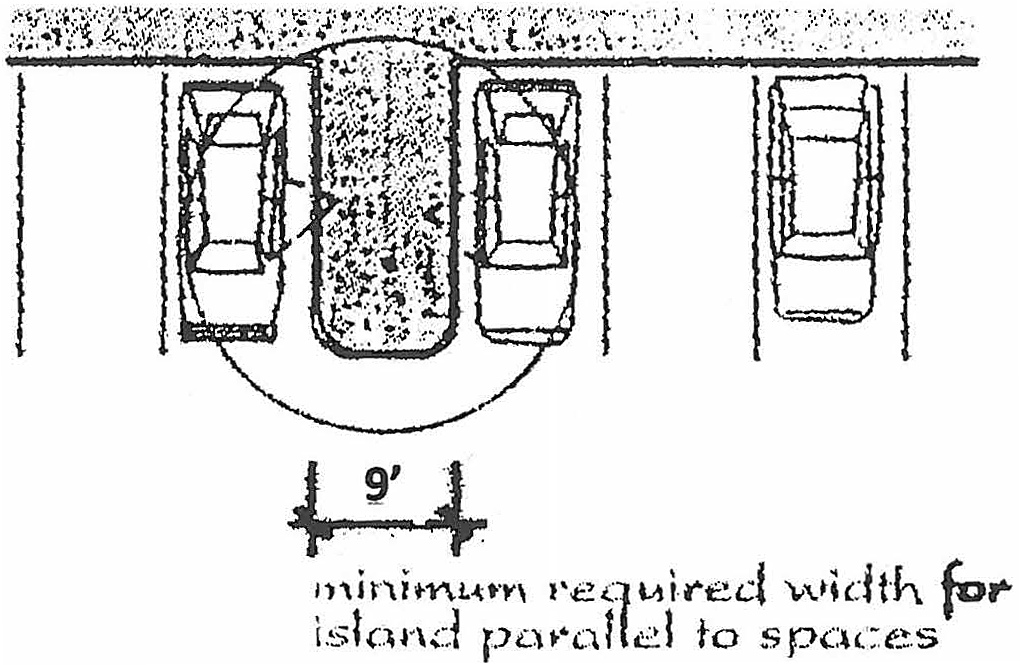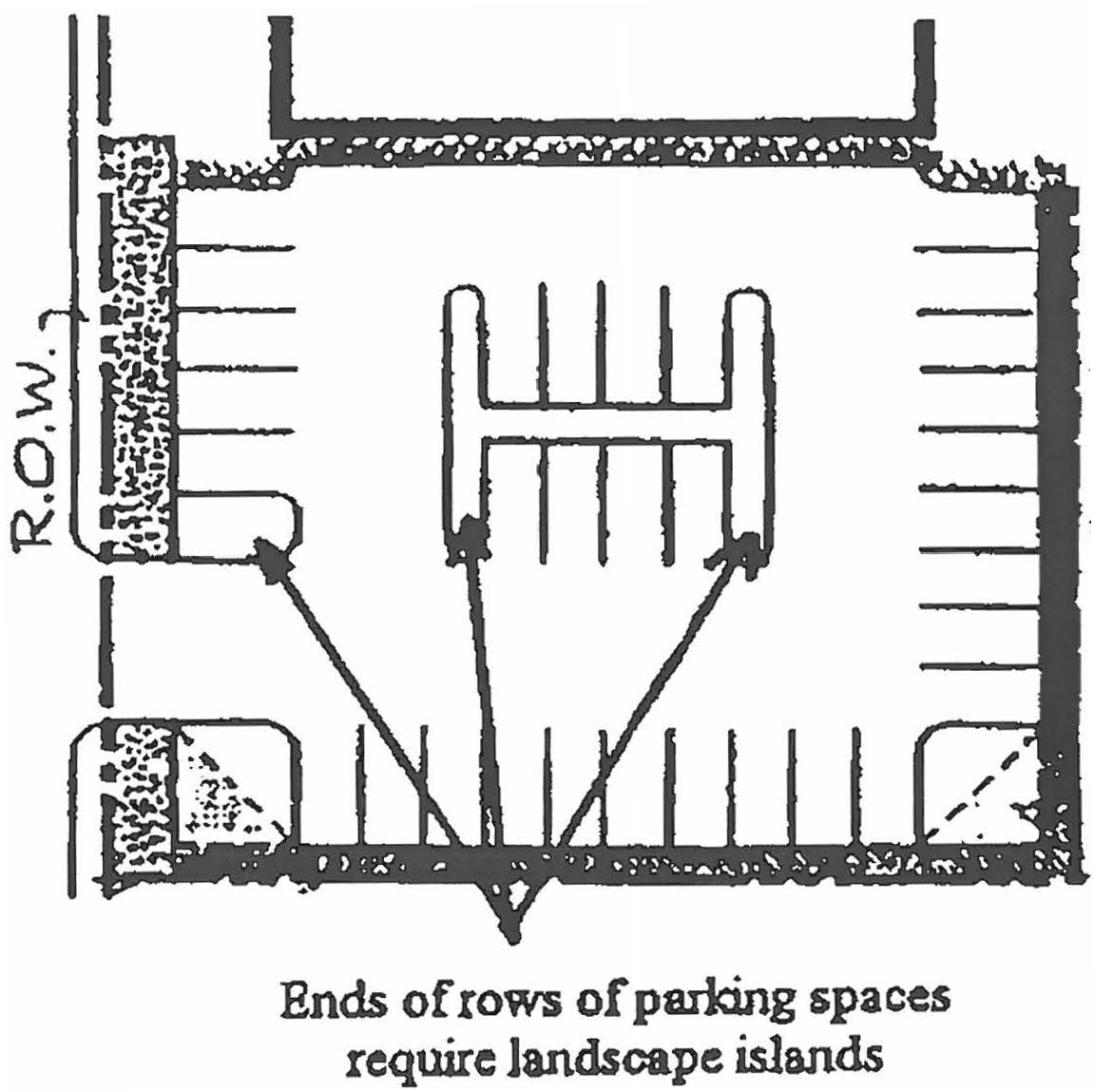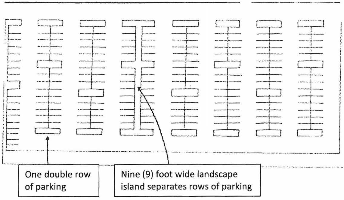 No more than four double rows of parking spaces shall exist without a landscape island extending the entire length of one double row of parking. Such tree landscape island shall be a minimum of nine feet in width and shall contain one shade tree per 40 linear feet of length and the balance of the area shall contain a permeable ground cover (see figure 7).