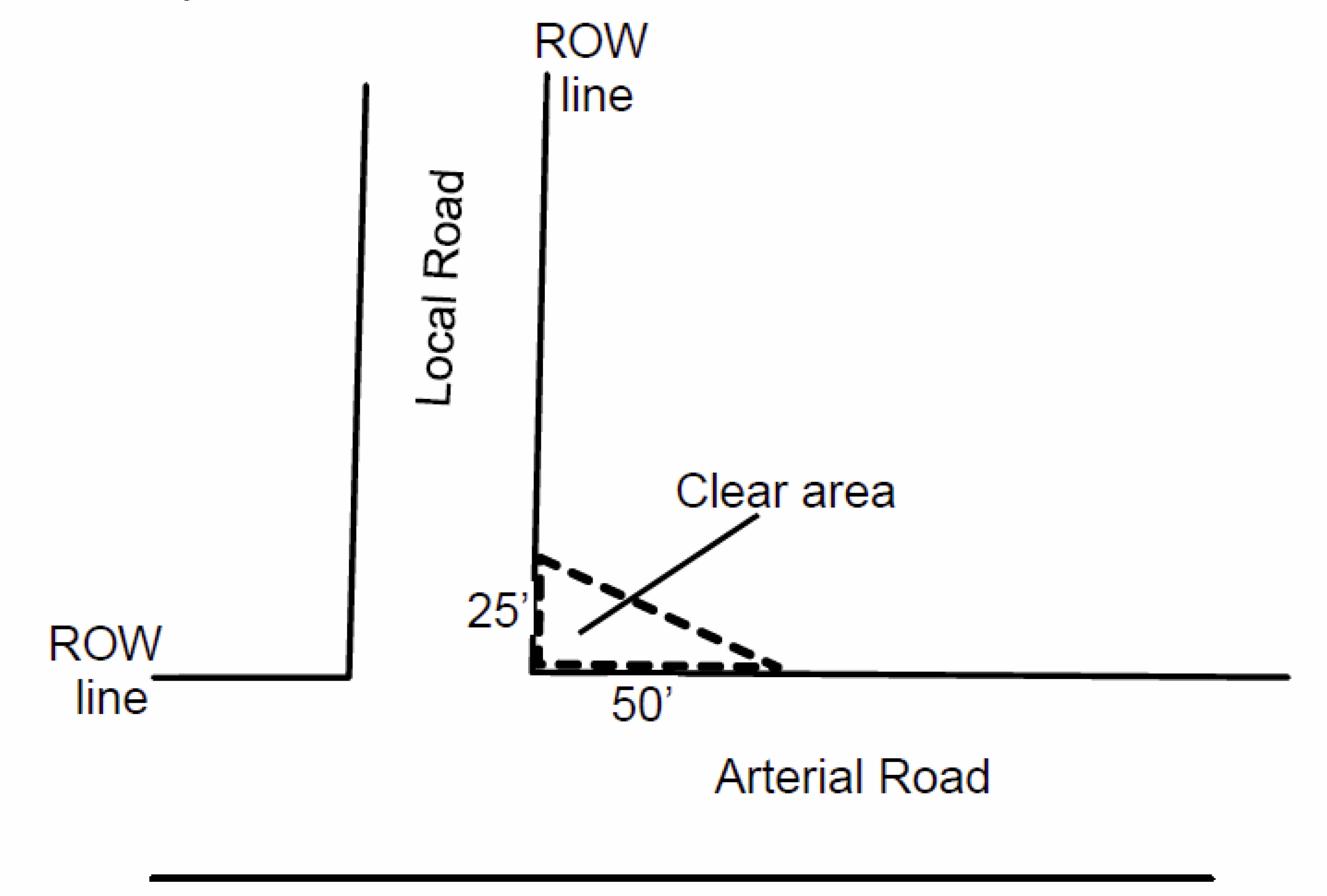 Sight Triangle. Sight triangles are used to avoid obstruction of vision at intersections. No walls, fences signs or landscaping shall be permitted on local road corner lots within a setback of 25 feet of intersecting street rights-of-way, and lots on collector and arterial roads within a setback of 50 feet of intersecting street rights-of-way if such a wall, fence, sign, or landscaping may obstruct traffic visibility. Combination of the various rights-of-way may be combined (See sample figure). The Village Engineer may review any clear site triangle for changes to the setback distances depending on sight conditions.