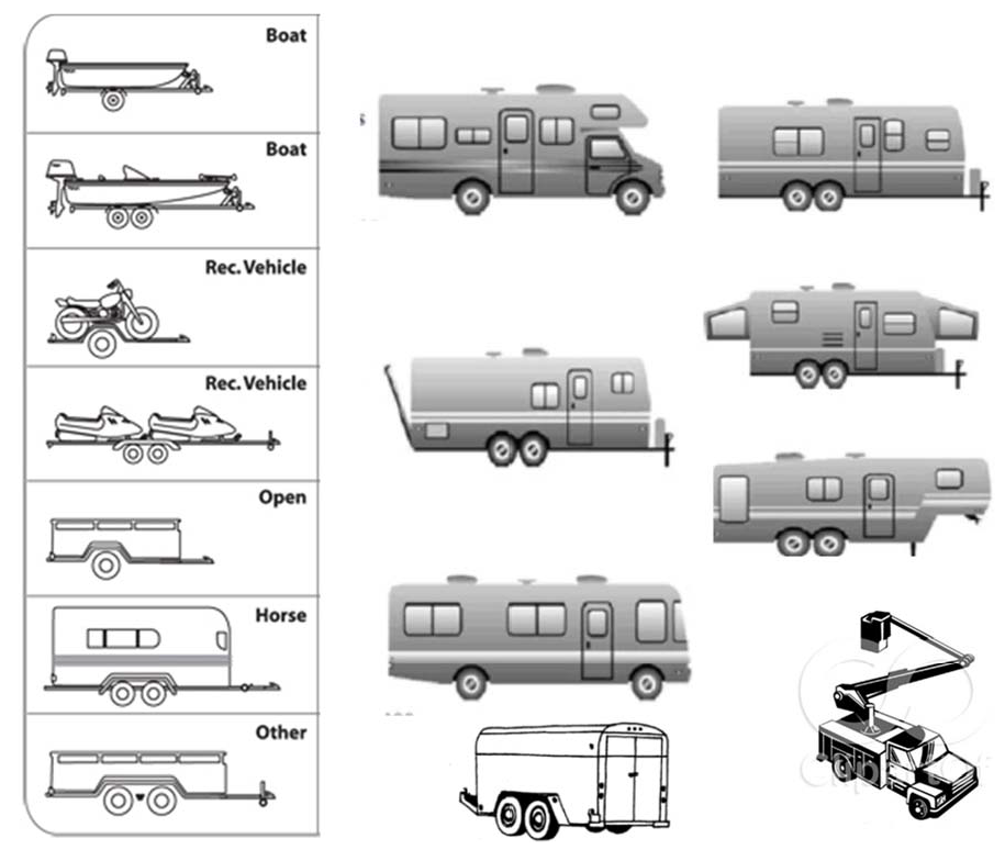 Heavy duty vehicles, as determined by the development services director, busses, and trailers such as those depicted below are not permitted. Semi-trucks and trailers shall not be parked/stored in any residential area or mixed-use land use district developed as residential. No semi-trucks, trailers or other motor vehicle designed primarily for drawing other trailers or vehicles shall be parked or stopped in the in residential areas unless such semi-truck or trailer is actively in the process of loading or unloading and then such vehicle may only be stopped or parked for such period of time as is necessary to complete the process of loading or unloading the vehicle. Under no circumstances may a semi-truck or trailer remain parked or stopped in any residential land use district or mixed-use land use district developed as residential overnight.