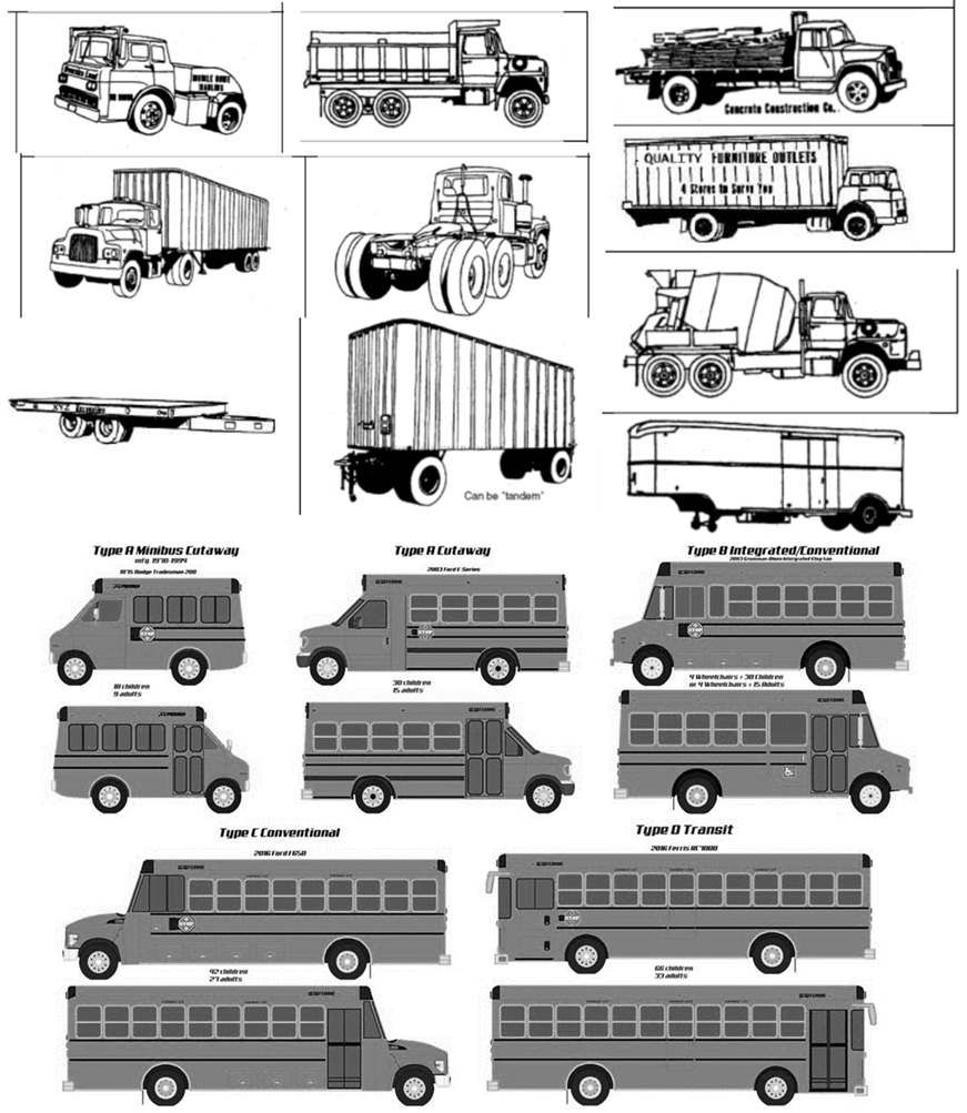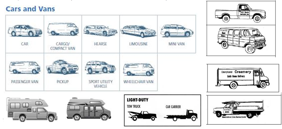 Passenger vehicles and light duty work vehicles, having only two axles and no tandem axles, such as those depicted below with no setback required.