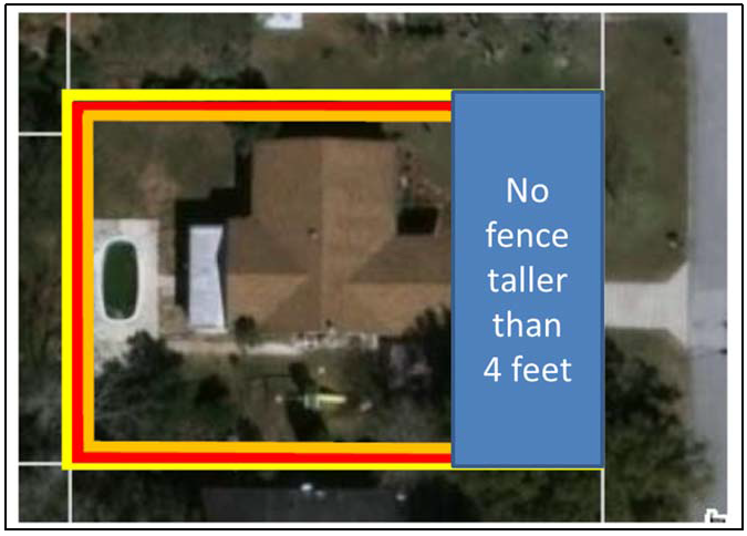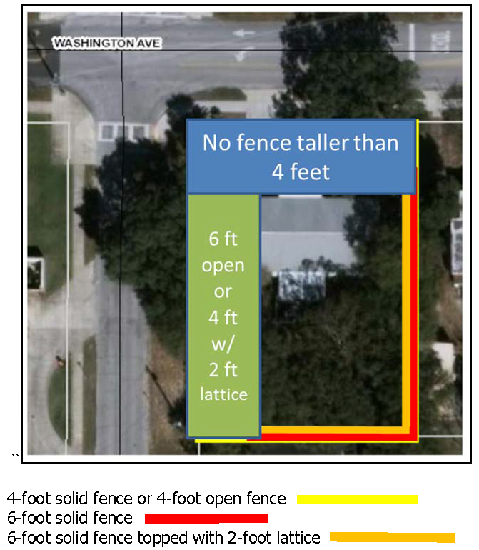 • In a secondary street setback, open fencing may be 6-feet high, but opaque fencing shall be limited to a height of 4-feet; 4-foot opaque fences in secondary street setbacks may be topped with additional 2-feet of open or lattice type fencing.