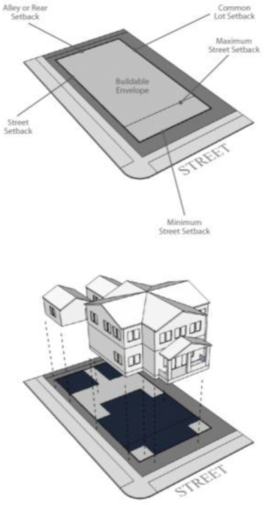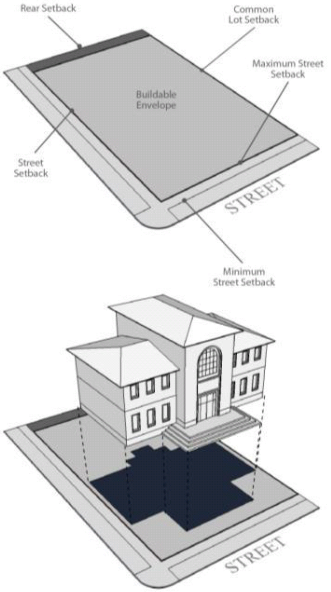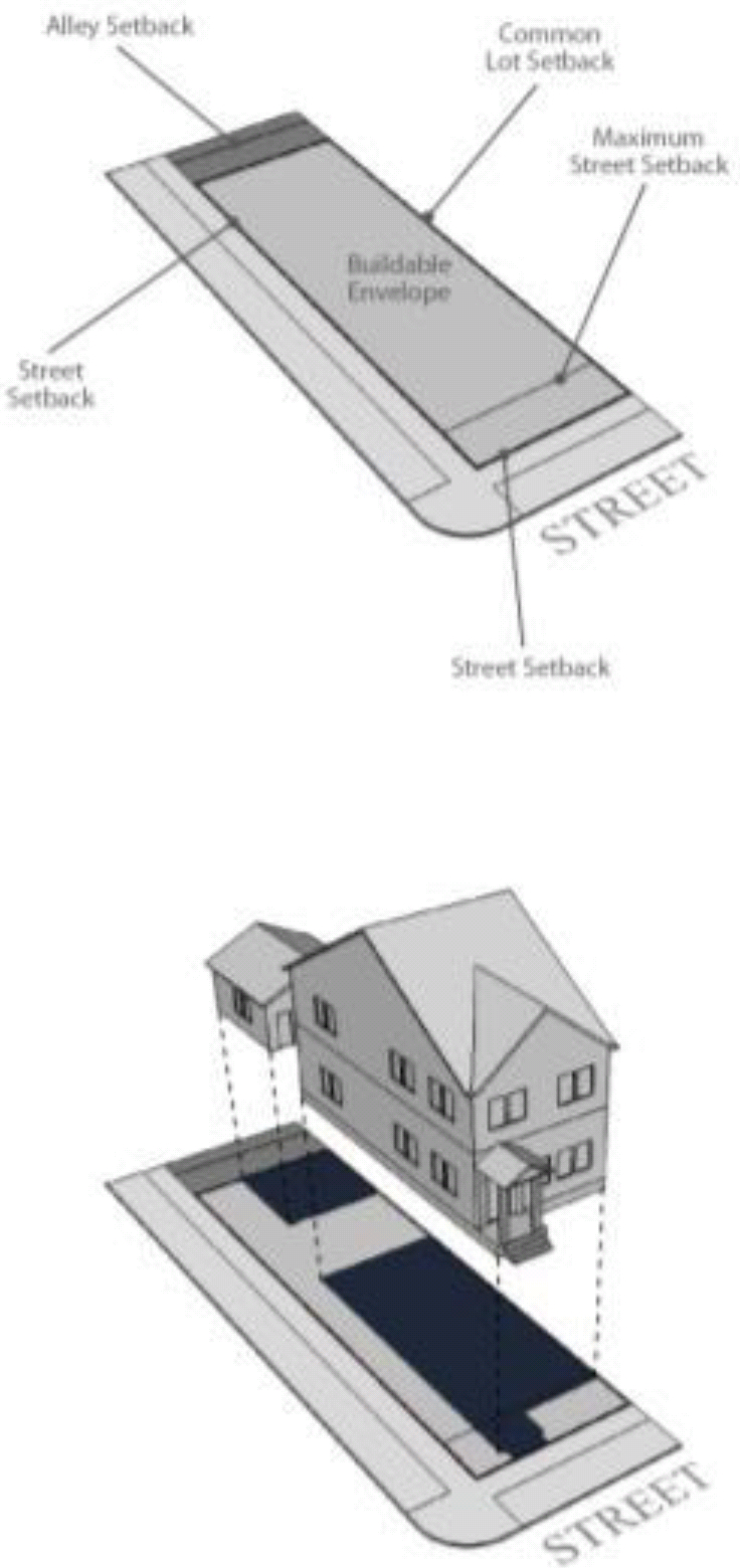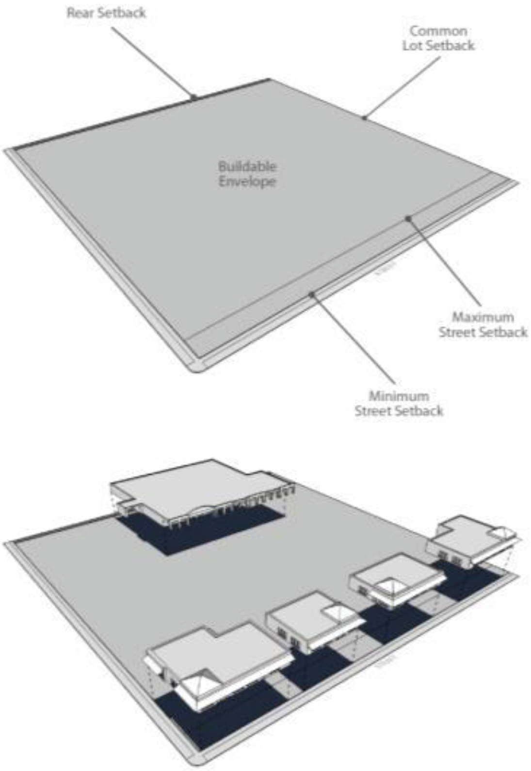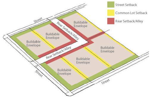 There are four types of yards: street, common lot, rear/alley, and lakefront. The building type standards regulate the street, common lot, and rear/alley yard areas as a part of the building envelope. Lakefront setbacks are included in section 121-9.