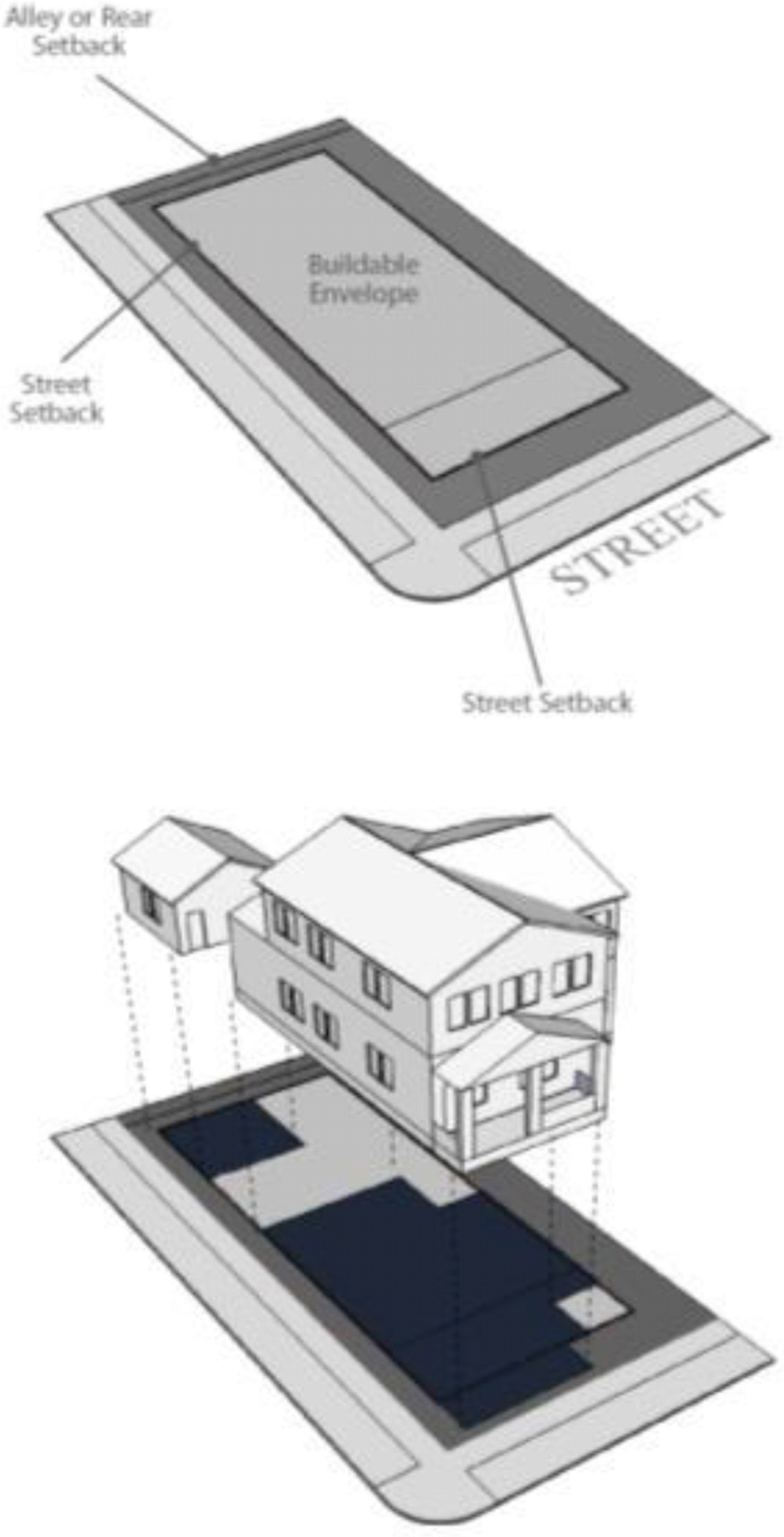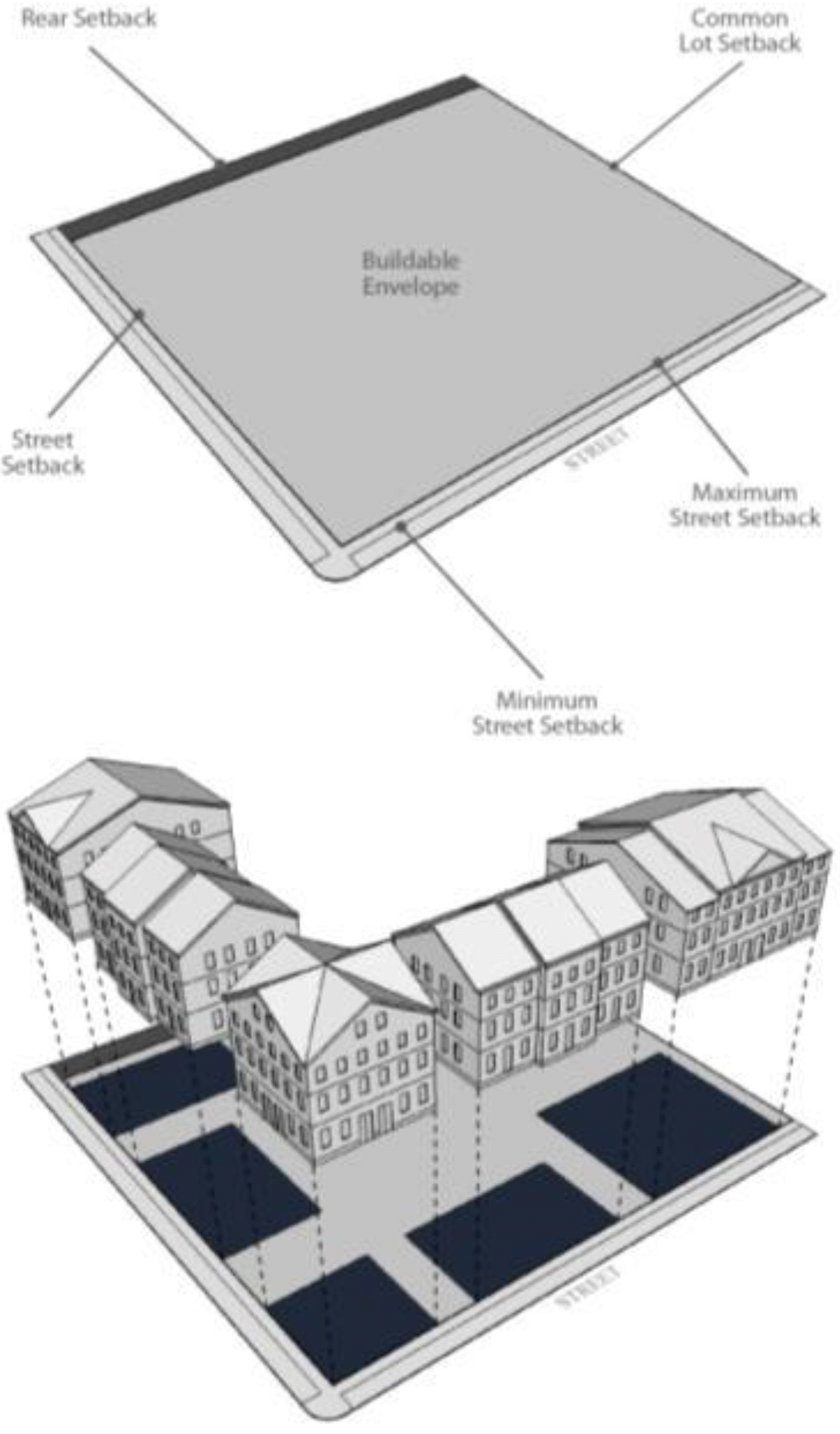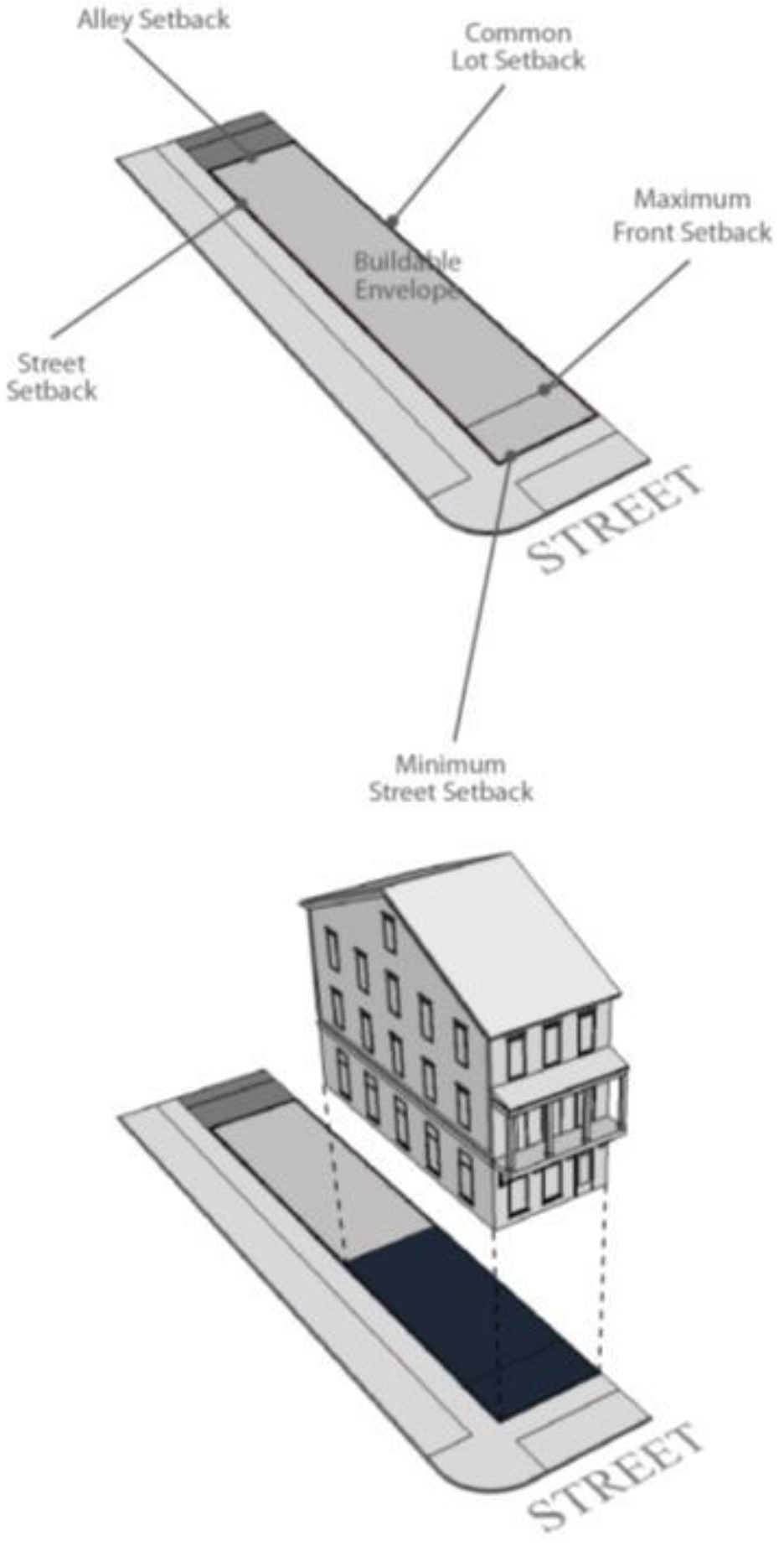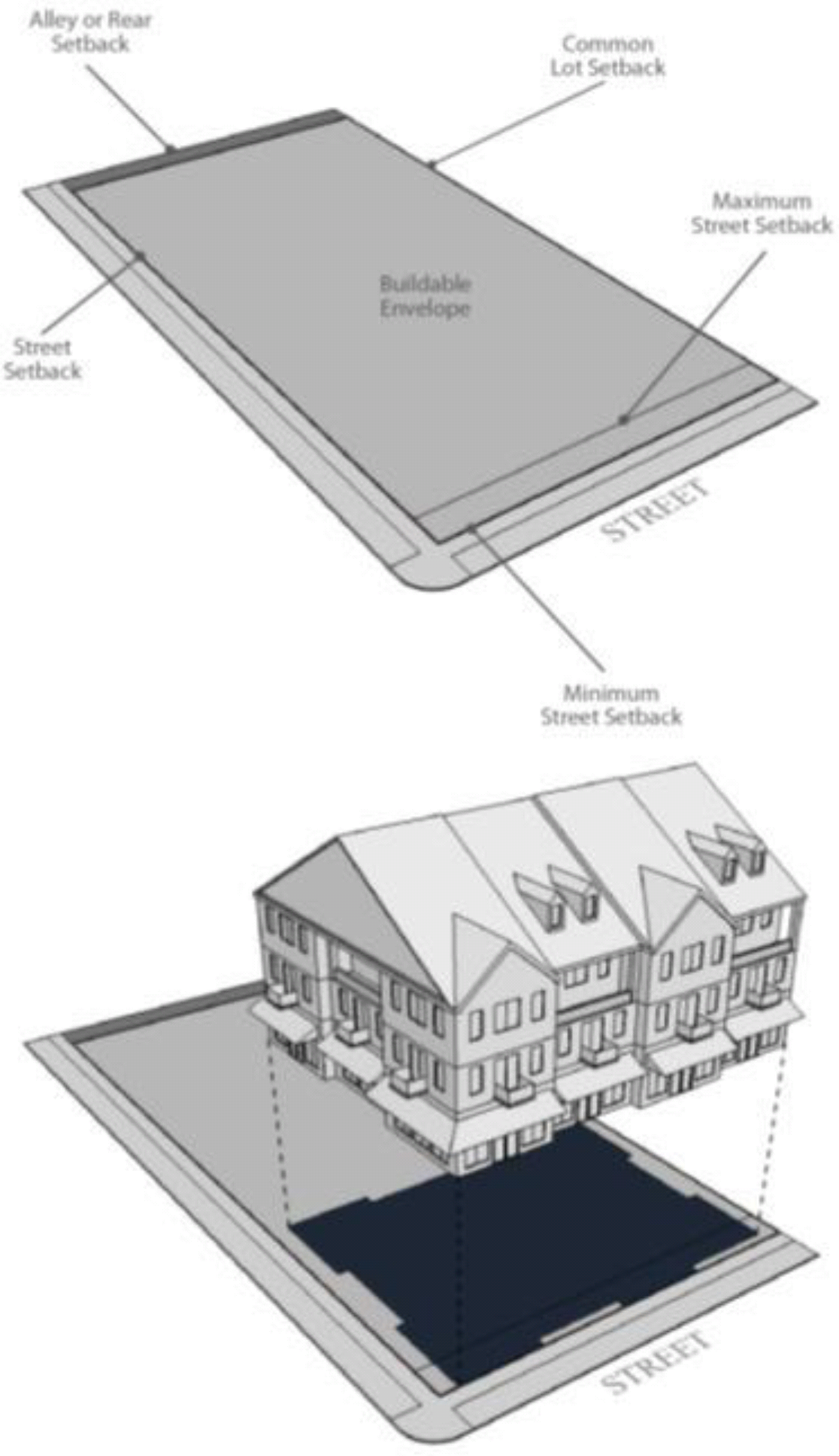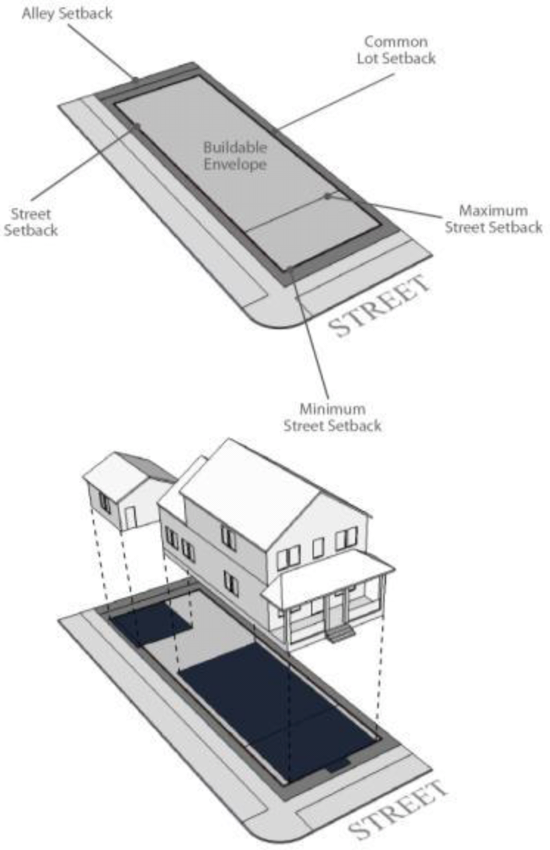 There are four types of yards: street, common lot, rear/alley, and lakefront. The building type standards regulate the street, common lot, and rear/alley yard areas as a part of the building envelope. Lakefront setbacks are included in section 121-9.