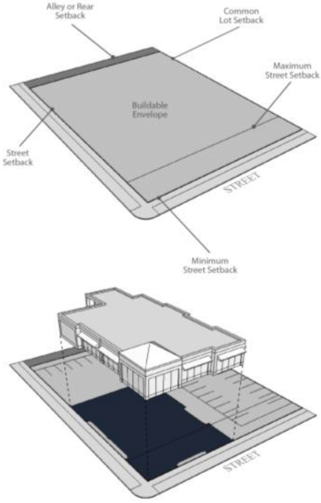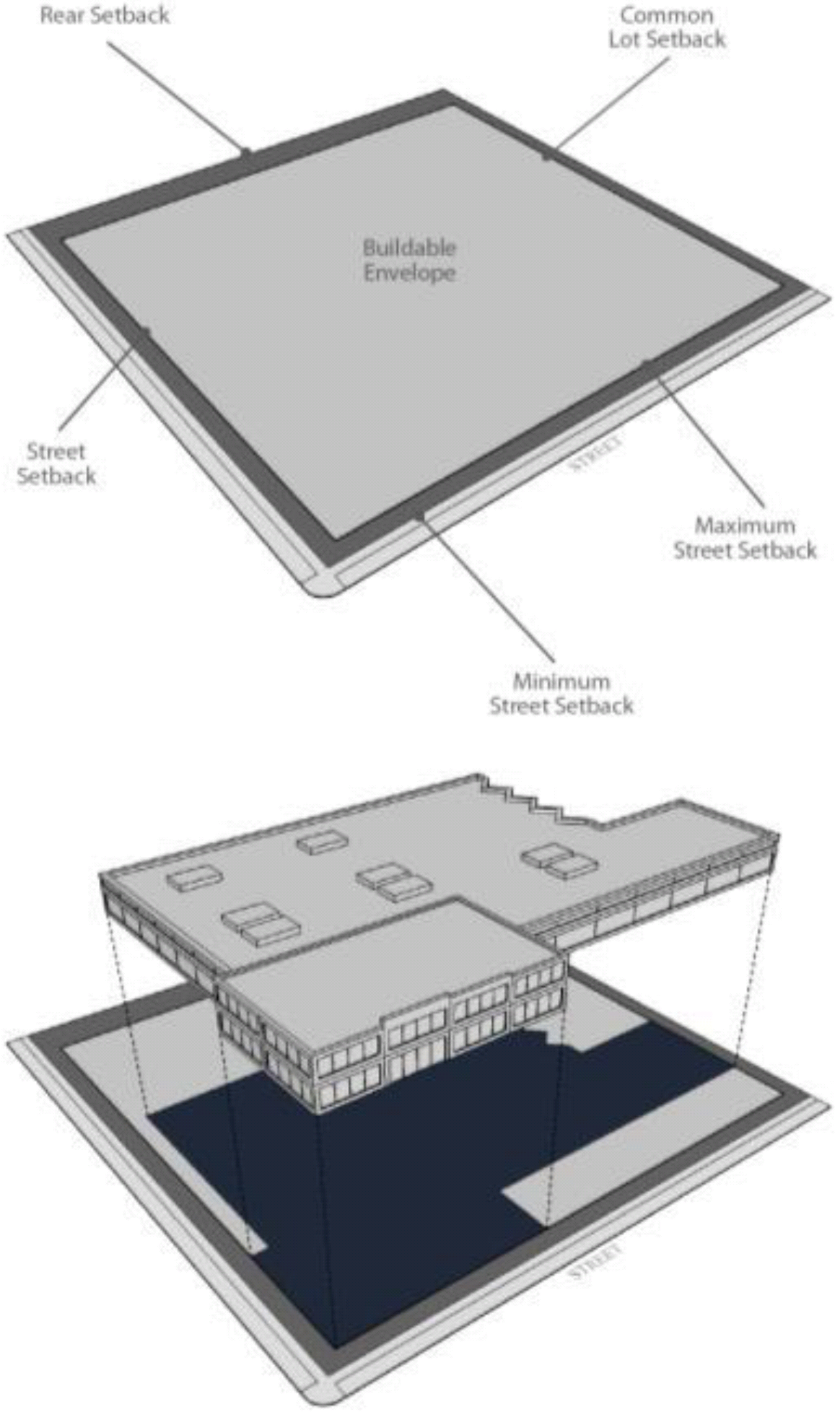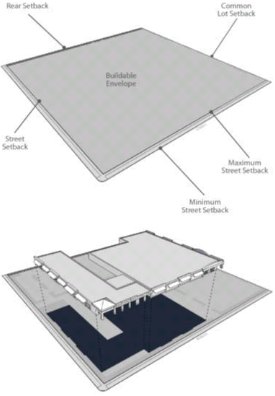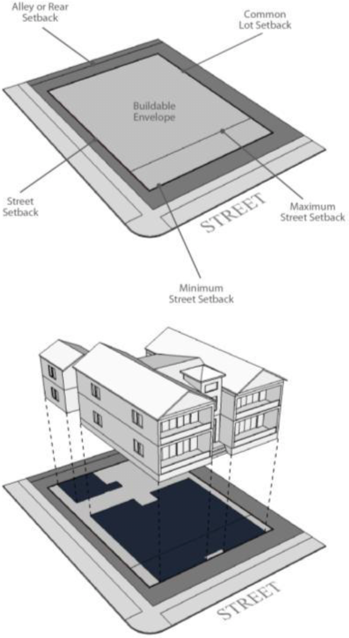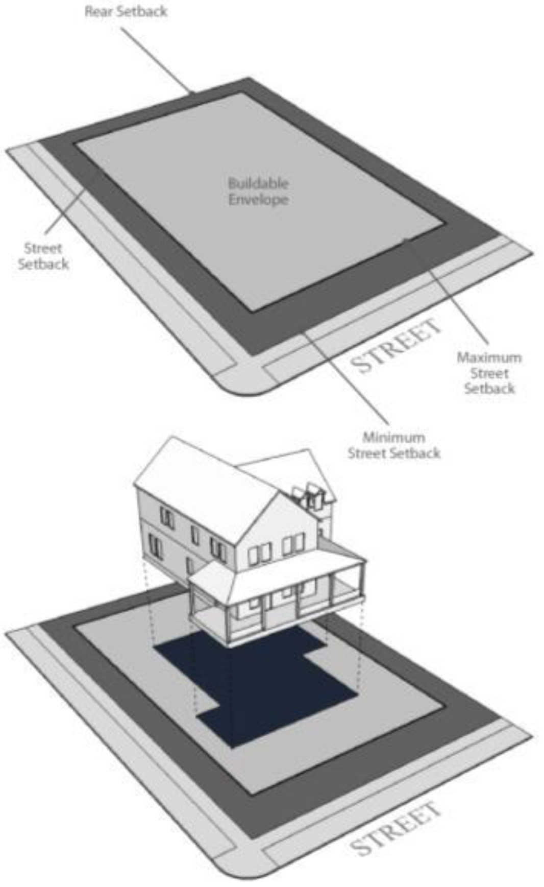 There are four types of yards: street, common lot, rear/alley, and lakefront. The building type standards regulate the street, common lot, and rear/alley yard areas as a part of the building envelope. Lakefront setbacks are included in section 121-9.