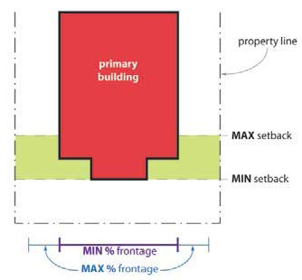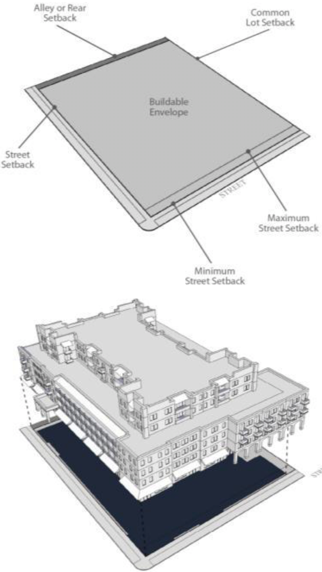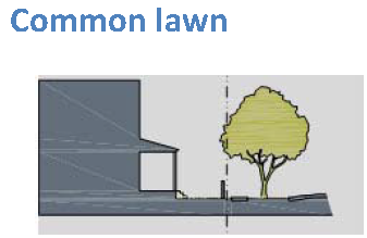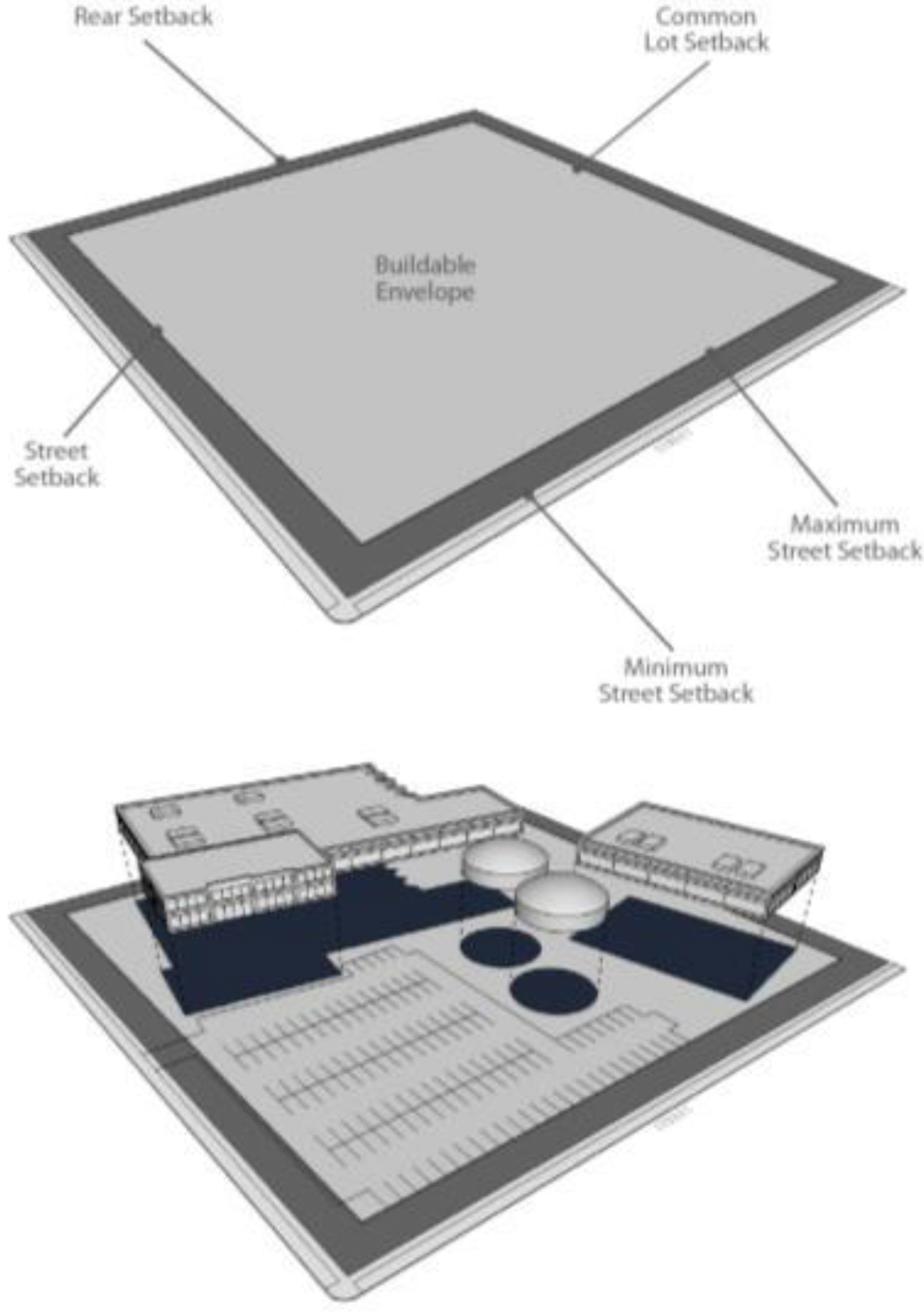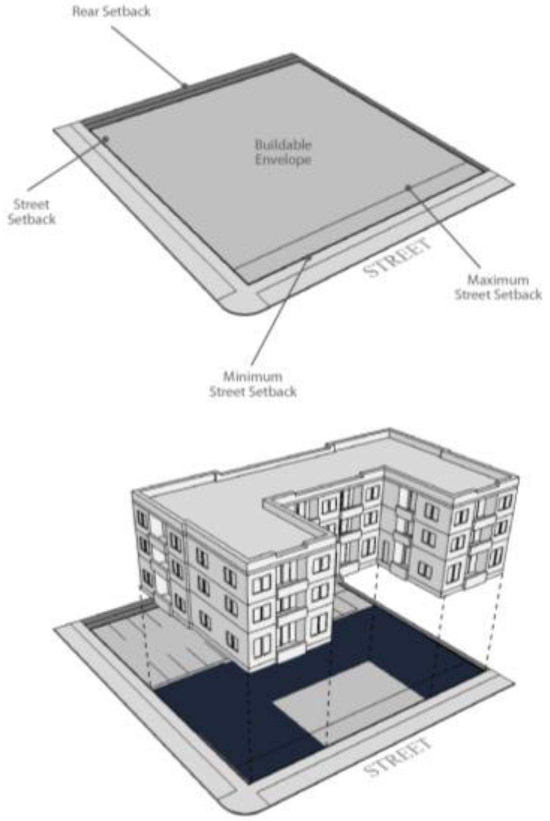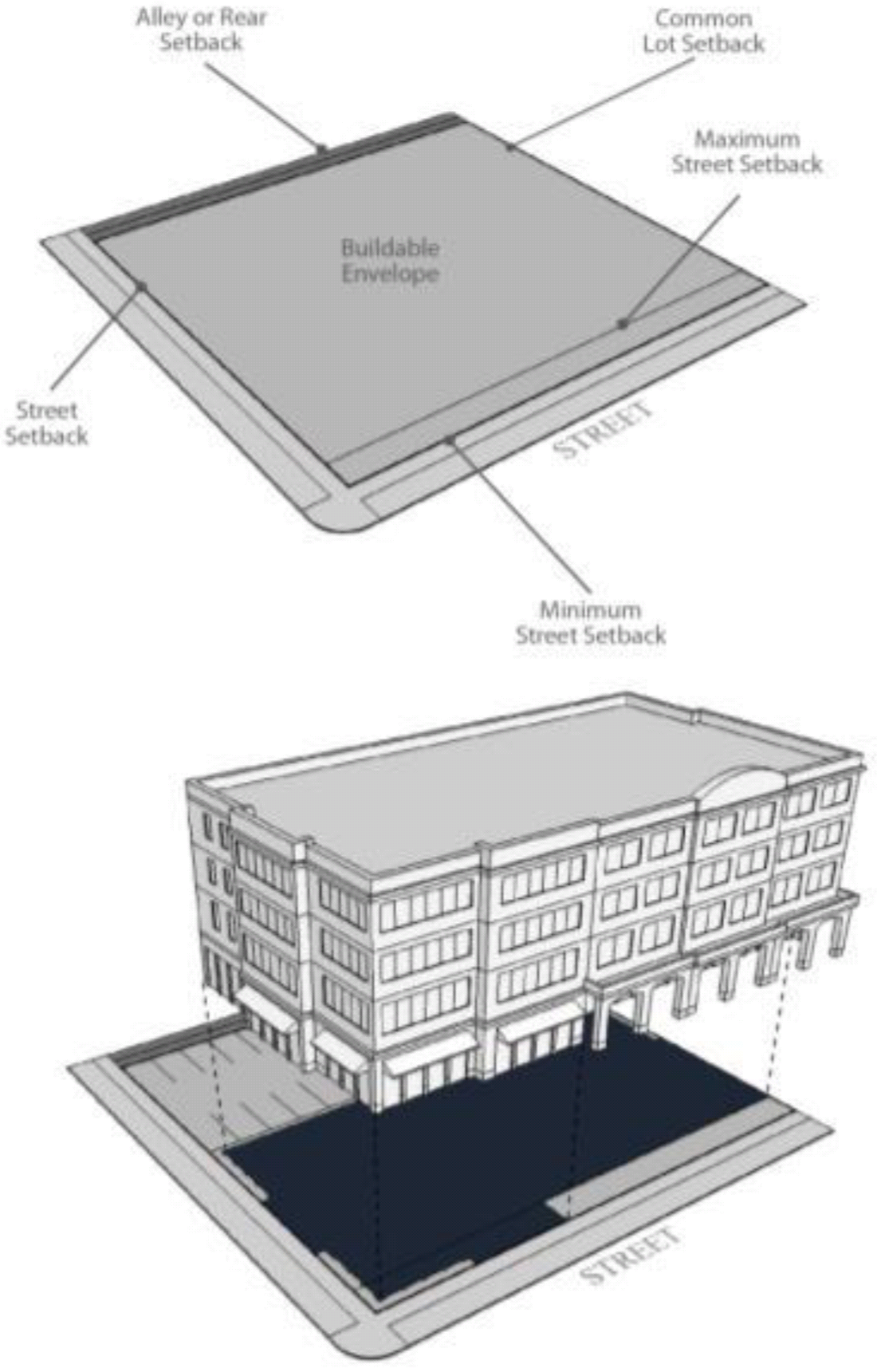 There are four types of yards: street, common lot, rear/alley, and lakefront. The building type standards regulate the street, common lot, and rear/alley yard areas as a part of the building envelope. Lakefront setbacks are included in section 121-9.