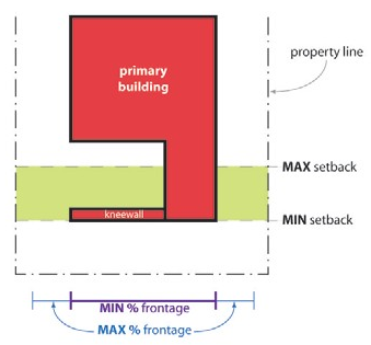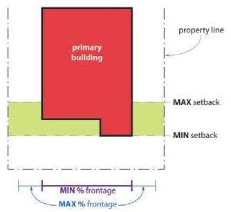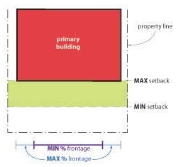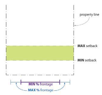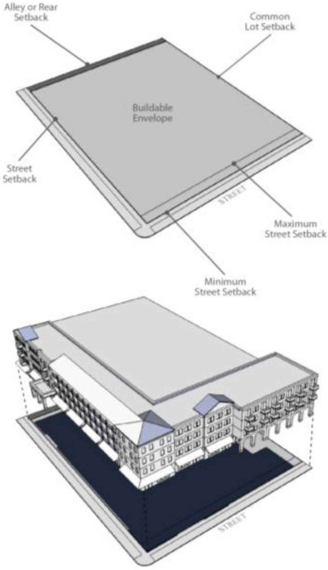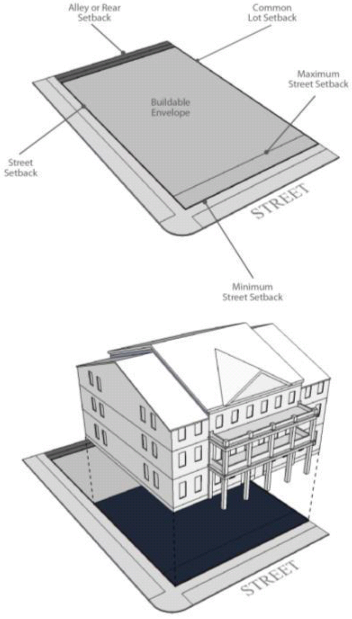 The building lot typologies specify the setbacks permitted within each building lot type and provide a minimum and maximum range. Approved lot splits prior to July 3, 2008, that have a reduced lot size, or depth shall be permitted to utilize the building lot types permitted within the perspective design district. Infill development shall rely on the established street yard setback for the street the building shall be constructed on. If the building setbacks vary, setback averaging shall occur. Calculation of the setback will be the measurement of existing setbacks per building on the block in which the new building shall be located. The setback may vary no more than 5' on any side, front or rear.