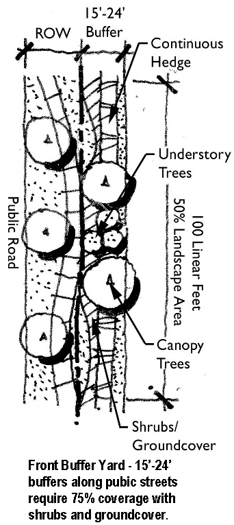 A landscape buffer (15 to 25 feet wide) is provided between the new lots and existing or platted lots; or