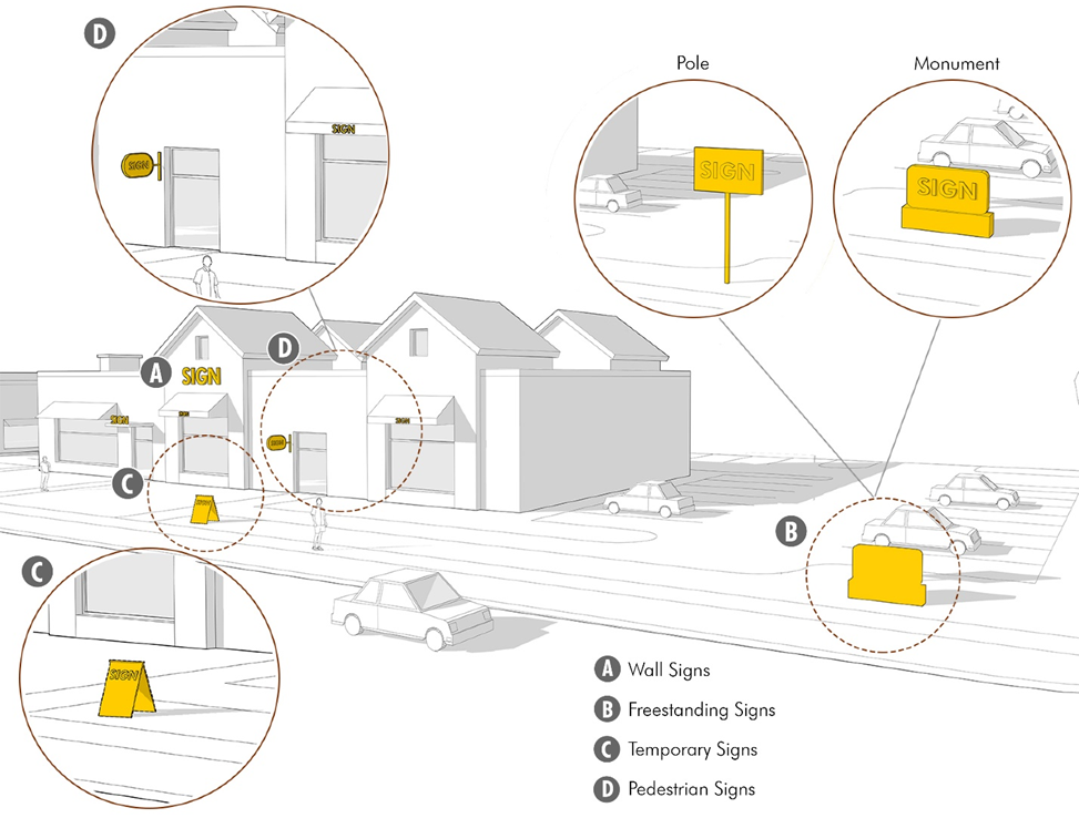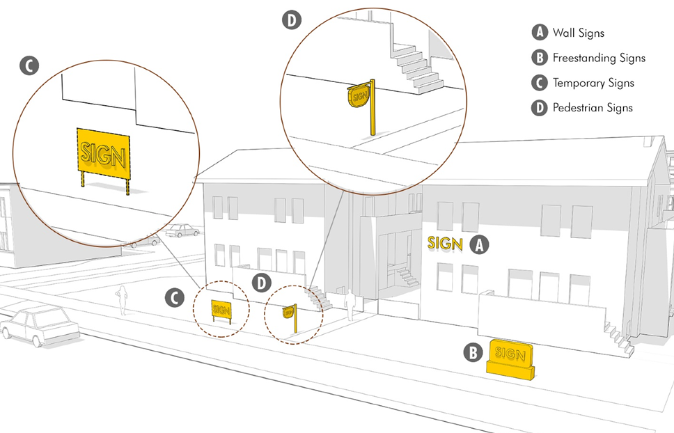 Pedestrian signs. Pedestrian signs should help create architectural variety and unique business identities from establishment to establishment. In multi-tenant buildings, pedestrian signs should be used to create interest and variety of the tenants, while overall building and site signs should create consistency and identity of the place and building.