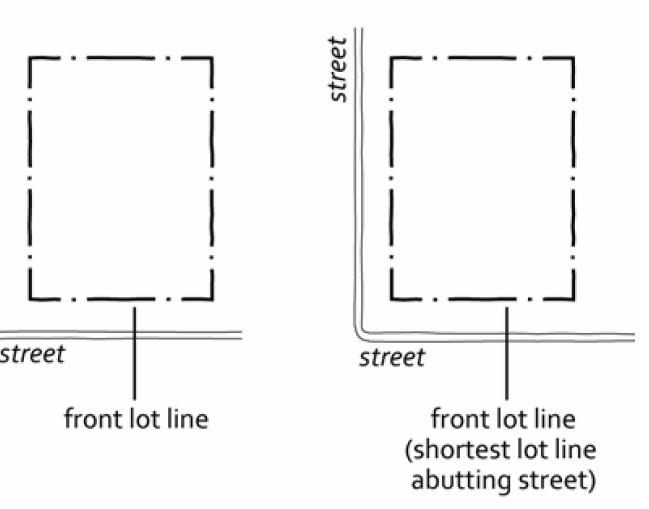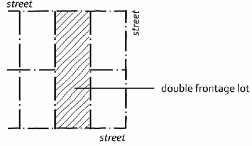 Street, frontage. The proximity of a parcel of land to one or more streets. An interior lot has one street frontage and corner lots and through lots have two frontages.