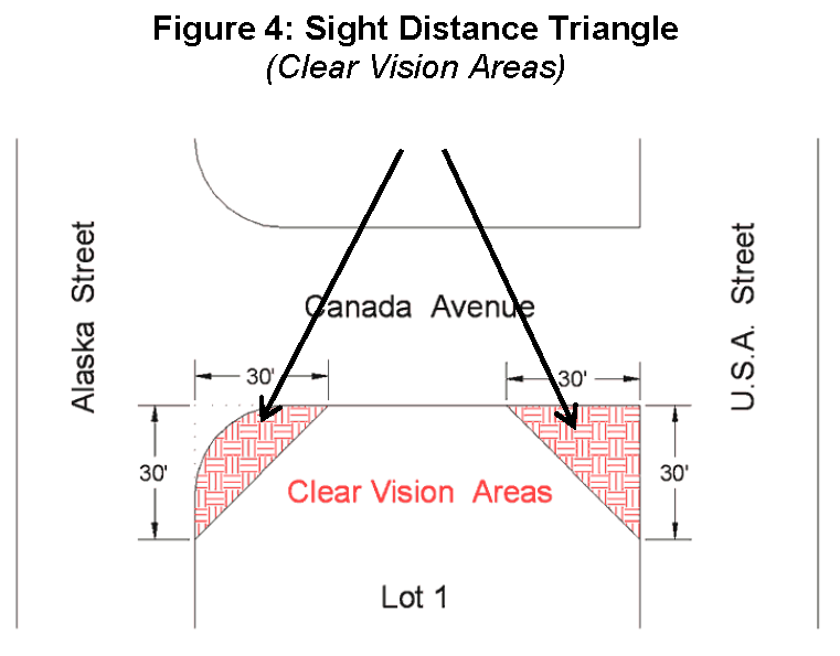 Sight distance triangle means the triangular area of a corner lot bound by the property lines and a line connecting the two points on the property lines 30 feet from the intersection of the property lines in which no obstruction, whether natural or man-made, shall intrude into the air space that is between two and ten feet above the level of the adjacent street; this area is known as the clear vision area. See Figure 4.