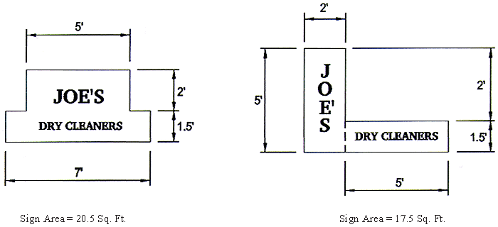 Signs composed of one (1) or two (2) individual sign faces: The area of the single largest sign face (if the sign faces are different sizes) shall be counted in calculating sign area by using the following formula. The area enclosing the perimeter shall be summed to determine total sign area. The perimeter of measurable area shall not include embellishments such as pole covers, framing, decorative roofing, etc., provided that there is not written advertising copy on such embellishments.