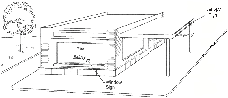 Awning, banner, bulletin board, canopy, changeable copy, creative, directional, identification, incidental, marquee, nameplate, portable, suspended, or similar two-dimensional signs.