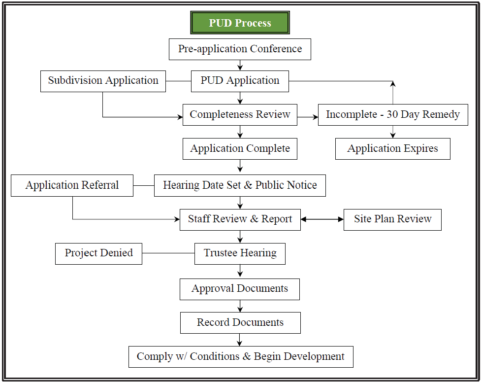 Approval of a PUD shall be subject to the submission of a full and complete application, the payment of all review and approval fees, preliminary review by the staff and final approval by written resolution by the Board of Trustees after a public hearing. All applicants for a PUD intending to subdivide or resubdivide land as part of the PUD plan shall concurrently submit and pursue a subdivision application as provided for in this Code. Review requirements for a PUD incorporating the subdivision or resubdivision of land shall be construed and applied together with subdivision requirements. PUD applications incorporating a minor or major subdivision shall be subject to the subdivision review procedural steps applicable to such subdivisions. Whenever PUD and subdivision application procedures or requirements overlap, the overlapping procedures or requirements shall be applied in a manner to avoid redundancies and process the application in an expeditious fashion.