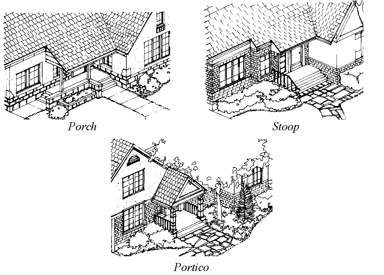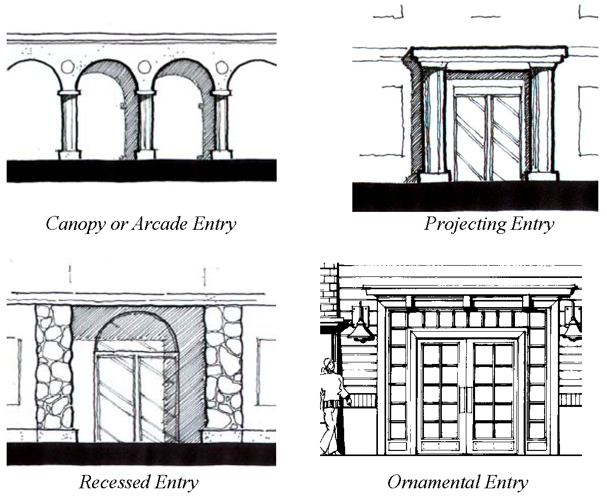 Primary entrances shall be articulated by one (1) or a combination of the following design elements (see Subdivision VII of this division, Figure 15-438-10):