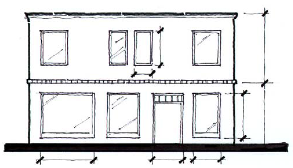 Window and door openings of fifty percent (50%) to eighty percent (80%) of the façade between zero feet (0') and fourteen feet (14') above grade, and having window or door openings of twenty-five percent (25%) to fifty percent (50%) of the façade above fourteen feet (14') (see Subdivision VII of this division, Figure 15-438-11);