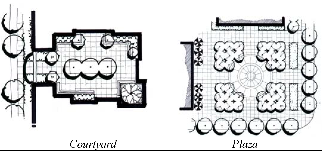Courtyards and plazas. Include courtyards or plazas within each block covering at least five percent (5%) of the block, bordering a public street or internal lane on at least one (1) side, and designed with landscape materials and public seating (see Subdivision VII of this division, Figure 15-438-13);