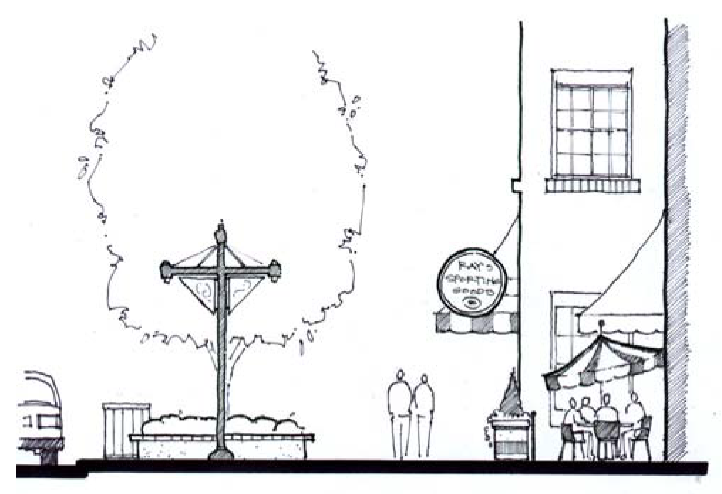 Enhanced storefronts with at least fifteen feet (15') wide sidewalks, landscape features such as planting beds or tree wells with ornamental trees, and public seating areas.