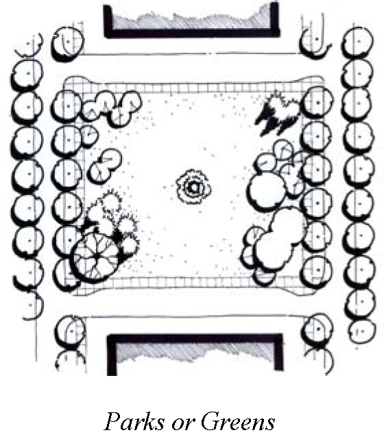 Parks and greens. Include at least fifteen percent (15%) of the plan area as small parks or greens, located as focal points for the plan in central locations. Each park or green shall also meet the following design standards (see Subdivision VII of this division, Figure 15-438-15):