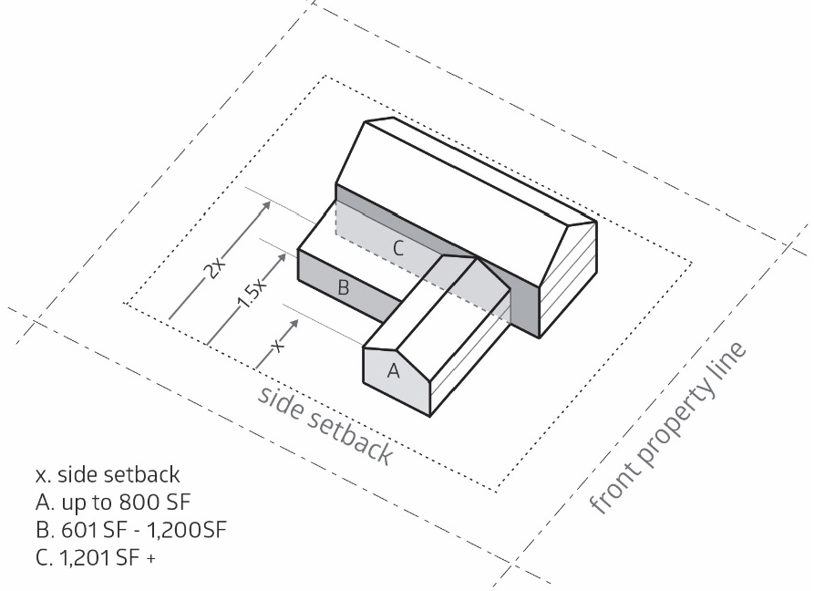 The front, interior side, and rear setbacks shall be the same as required for all other lots;