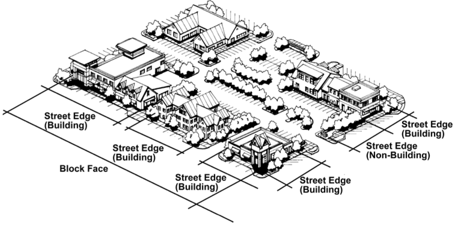 The street edge shall occupy at least seventy percent (70%) of each block face. Areas without a street edge may be open to provide access to parking, courtyards or plazas subject to other design standards in this article.