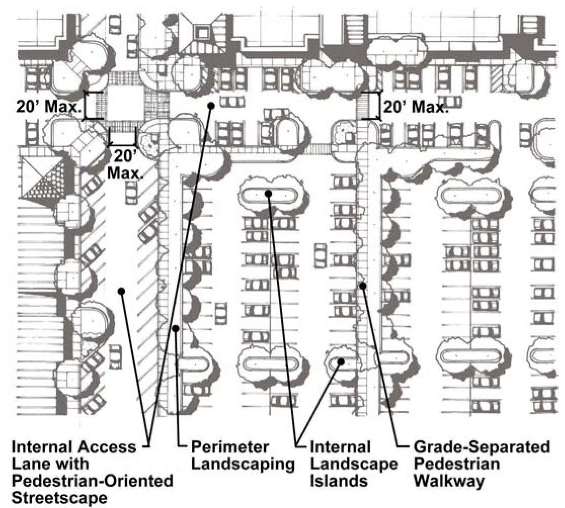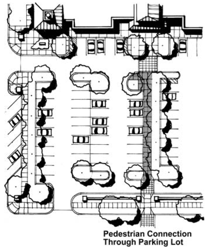 For lots greater than eighty (80) spaces, the pedestrian connection shall be separated from the parking surface by either a grade separation or be located within intervening planting strips so that the pedestrian connection is dedicated solely to pedestrian use [See Section 15-492, Figure 15-492-4].