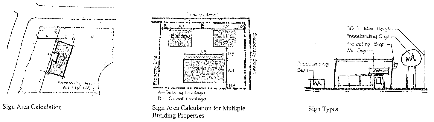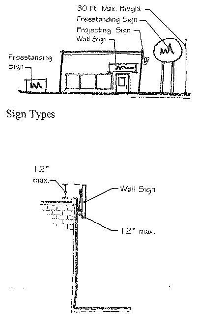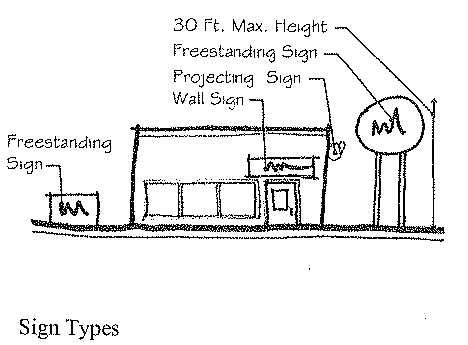 Freestanding signs, including monument and pylon signs, wall signs, canopy signs, awning signs or projecting and hanging signs.