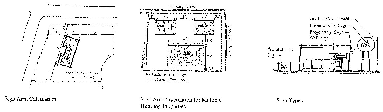 The overall area of all signs shall not exceed one and one-half (1½) square feet of signage for each lineal foot of building frontage plus one additional square foot of signage shall be permitted for each lineal foot of street frontage.