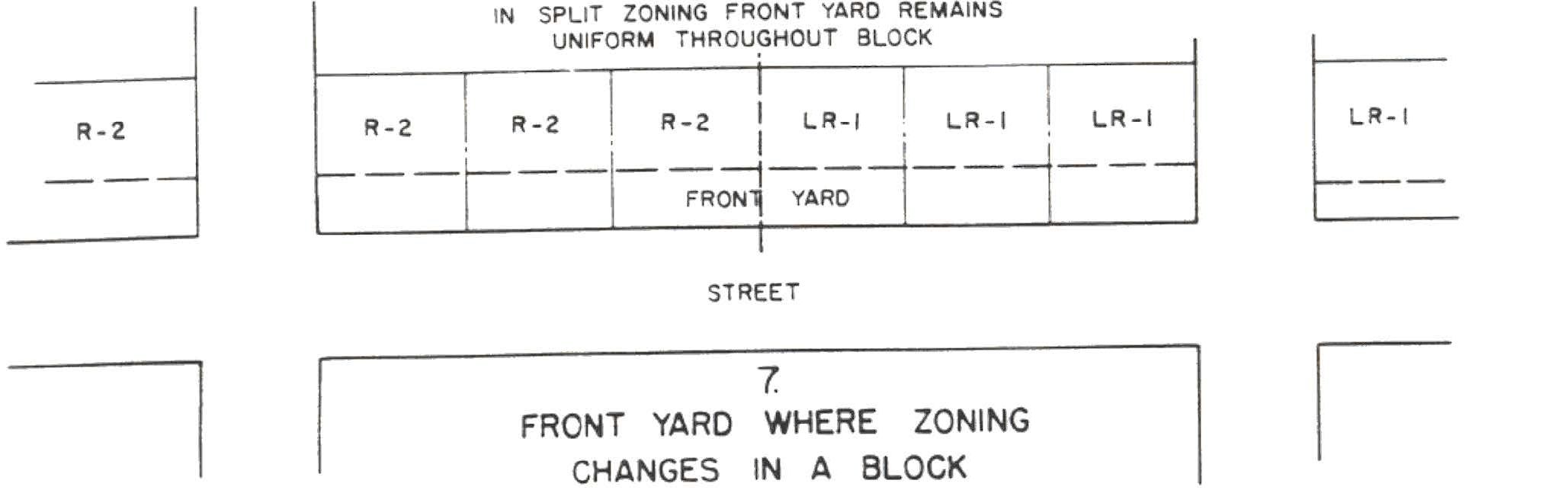 Where the frontage on one side of a street between two intersecting streets is divided by two or more zoning districts, the front yard shall comply with the requirements of the most restrictive district for the entire frontage.