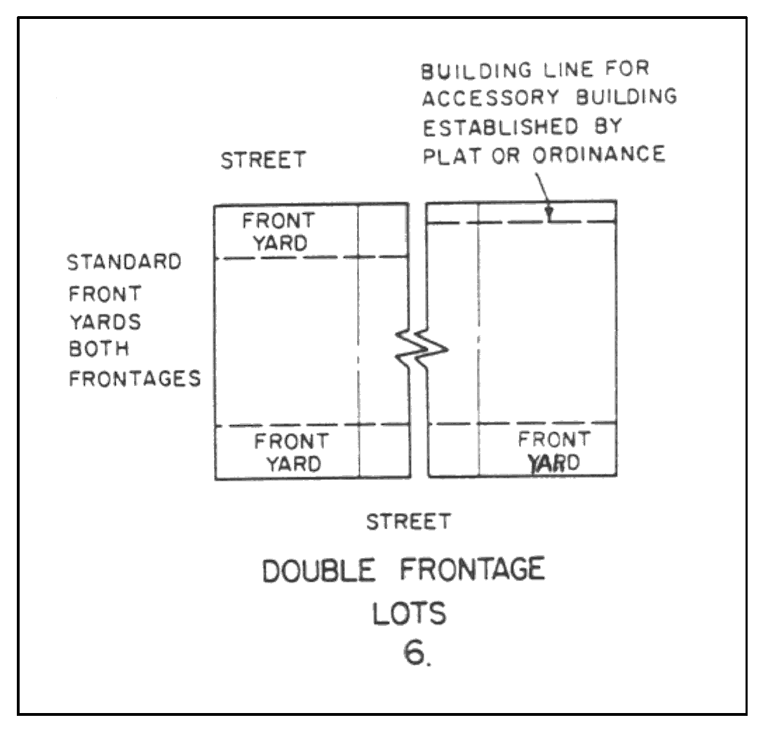 Where lots have double frontage, running through from one street to another, a required front yard shall be provided on both streets unless a building line for accessory buildings has been established along one frontage on the plat or by prior ordinance, in which event only one required front yard need be observed.