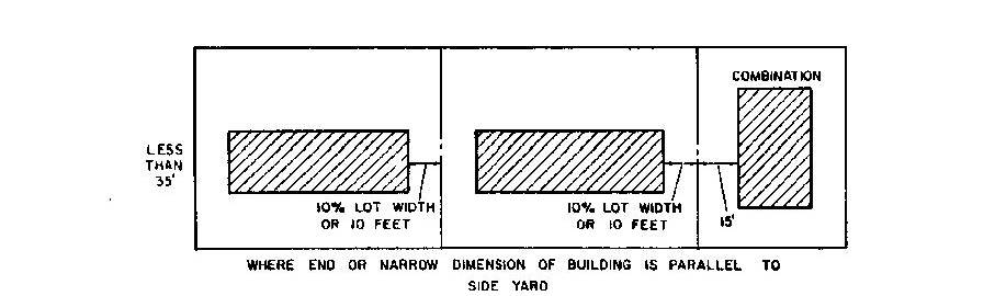 The side yard adjacent to a side street of a lot developed with a one-family attached dwelling shall be not less than 30 feet. The end of each one-family attached dwelling complex shall have a side yard of not less than 10 feet so that the end of any two adjacent building complexes shall be at least 20 feet apart.
