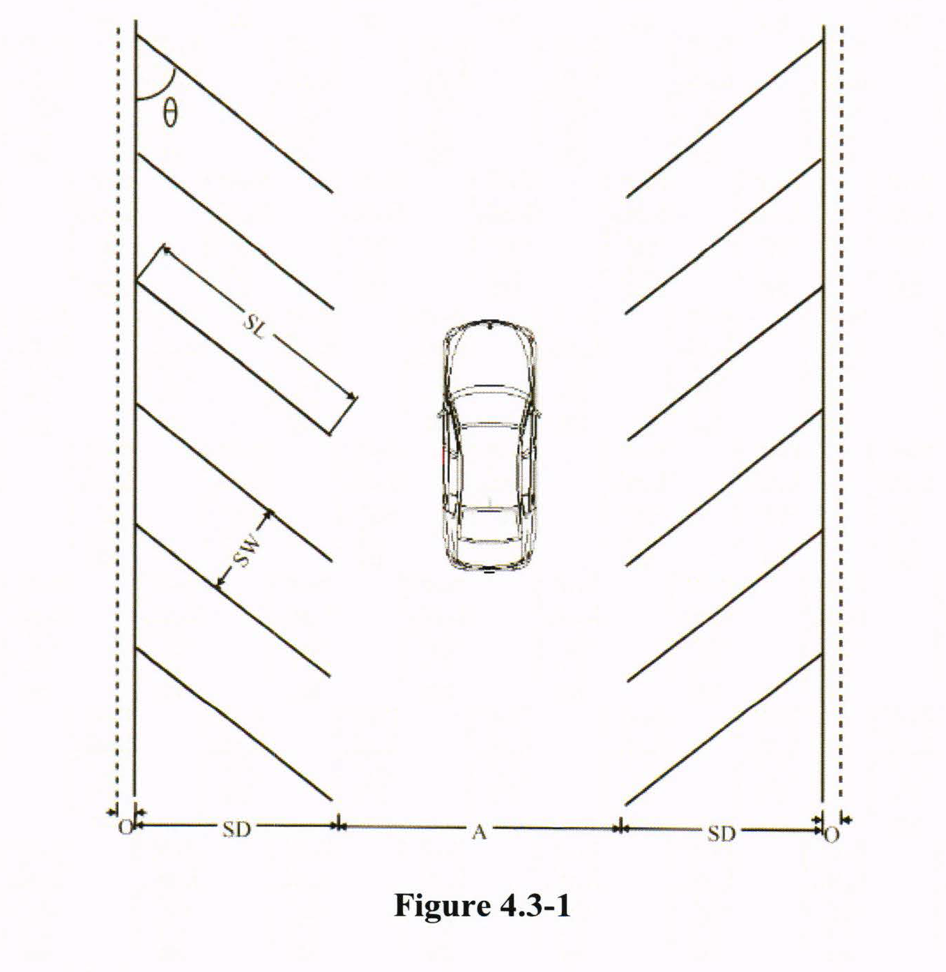 Parking spaces required by this section shall be in accordance with the minimum standards set forth in Figure 4.3-1 and Table 4.3-1.