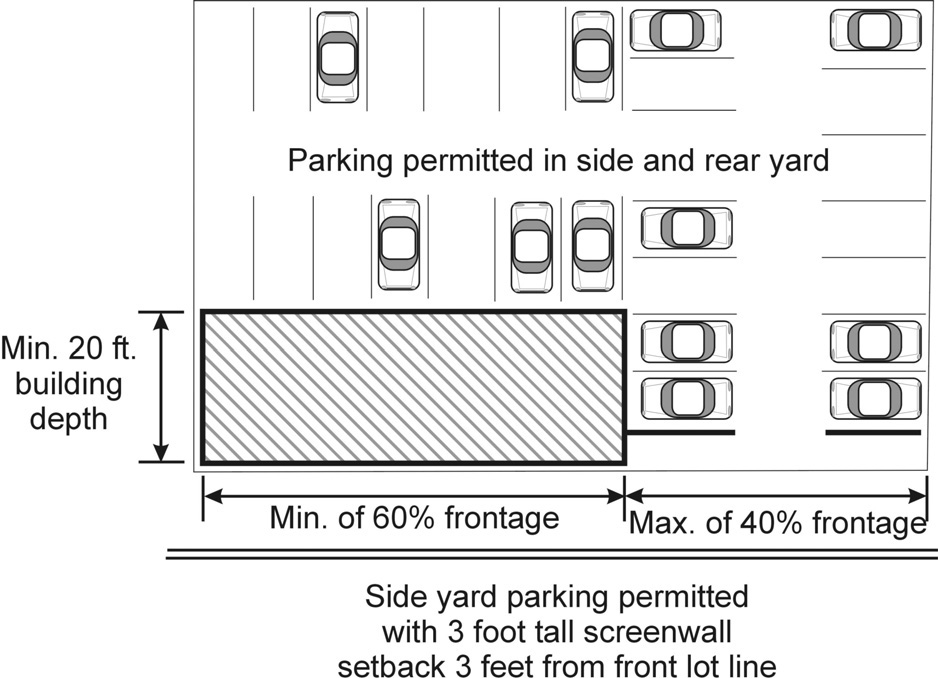 Parking is permitted only in side and rear yards. When parking is located in a side yard (behind the front building line) and has frontage on a public right-of-way, no more than forty (40) percent of the total site's frontage shall be occupied by parking. Parking in the side yard shall be screened by a three-foot tall brick screening wall between the sidewalk and the parking lot. The screening wall shall be set back a minimum of three (3) feet and designed and located to ensure a safe, clear vision zone is provided for vehicles and pedestrians.