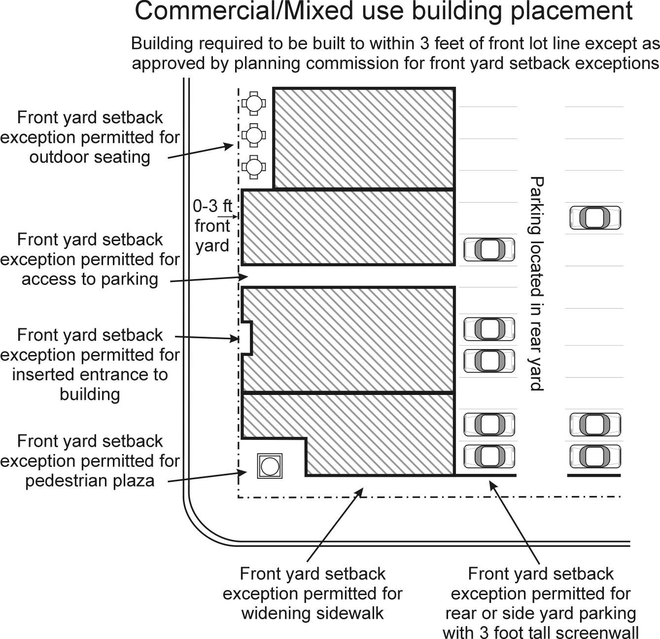 Parking shall not be permitted between the front of the building containing the pedestrian entrance and the front lot line. Off-street parking shall be to the side or rear of the building. Where side yard parking is visible from the street, a streetwall shall be provided consisting of a picket fence, ornamental wrought iron fence, a brick wall or a continuous evergreen hedge.