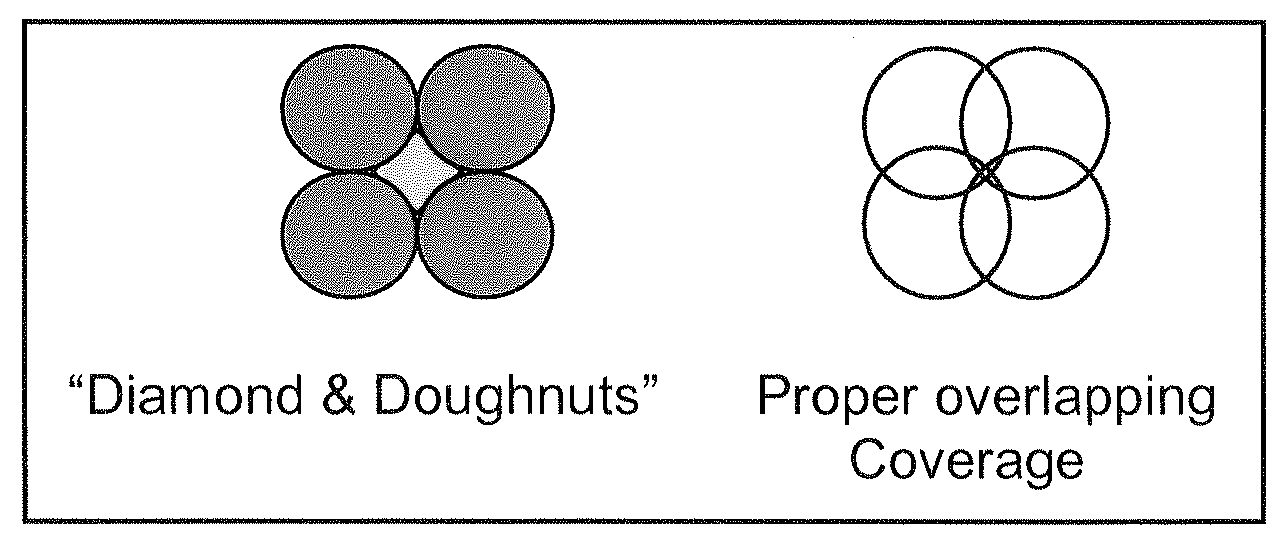 Turf heads must be placed to provide head to head coverage, meaning the radius of one head must reach the base of the adjacent head. Improper coverage will result in dry spots with "diamond and doughnuts" or over watering to compensate for the lack of coverage. Refer to the manufacturer's product literature for the proper radius, gallons per minute and pressure performances.