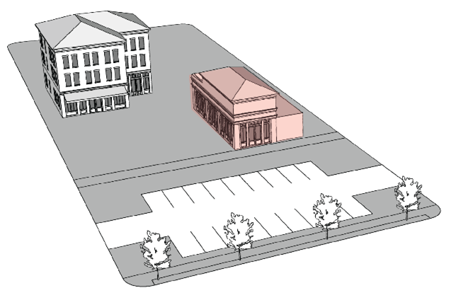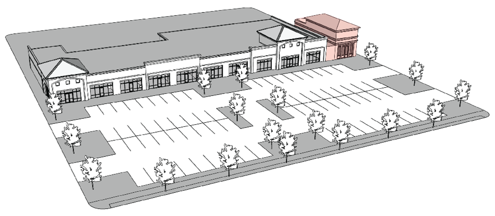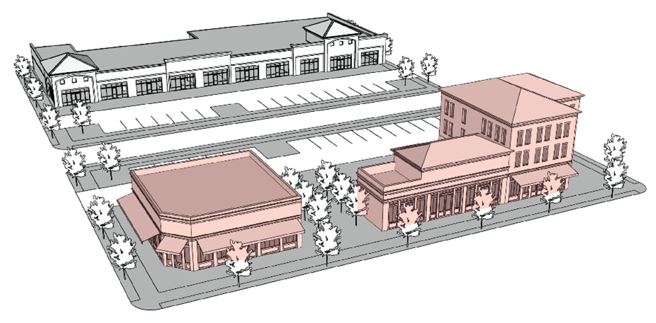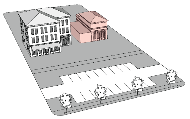 Side: Addition (Large Building) with a new connected street. If a connected street is added, side additions are now allowed because the new street establishes a new build-to-zone. The new street shall be selected from the allowable street types for the zoning district and shall conform to block standards (block lengths).