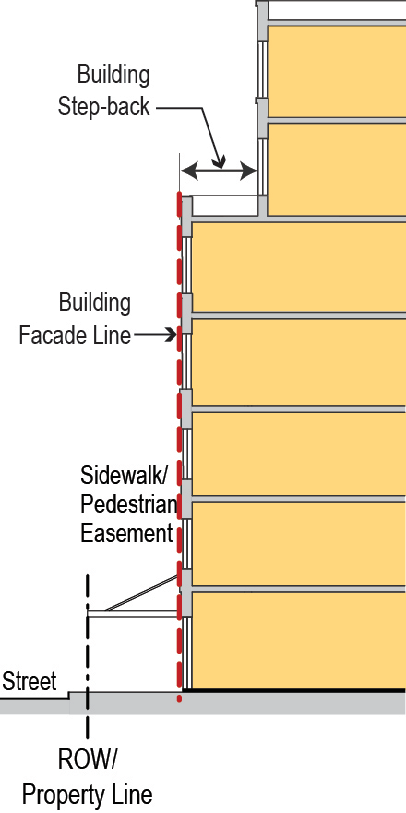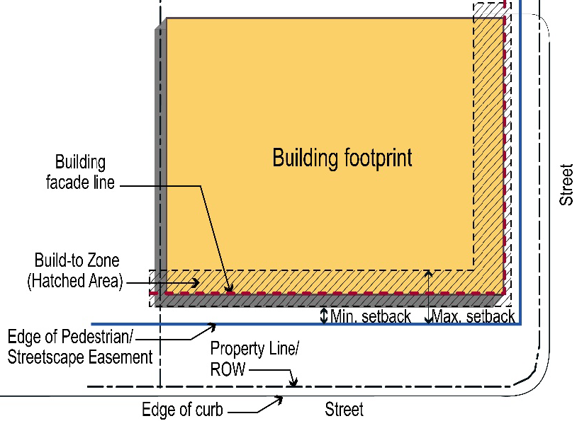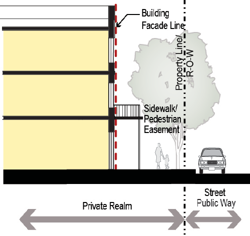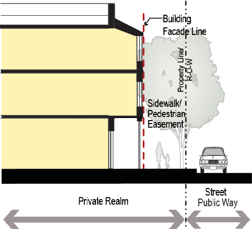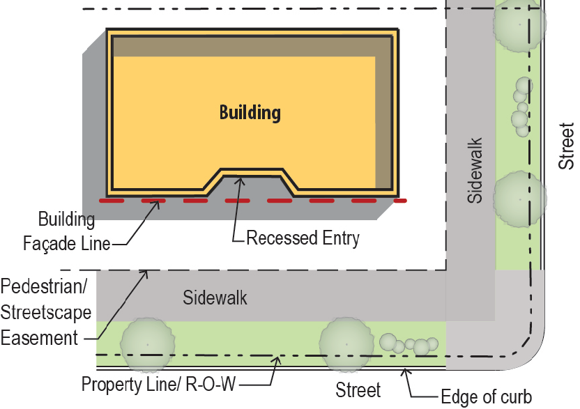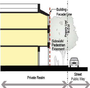 The area between the building and edge of the vehicular or parking lanes. The principal