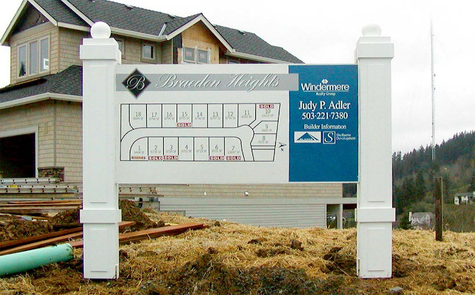 Design standards. Signs shall be constructed of brick, stone, fiber-reinforced cementitious board, ceramic or porcelain tiles, stucco, or other materials of similar characteristics and quality. Signs shall be a ladder type with individual sign panels of uniform height and background color. Sign installations shall include breakaway 1 design features (if located in or within 20 feet of an existing or planned public right-of-way) and shall meet all other safety requirements outlined in the Design Criteria and Construction Standards.